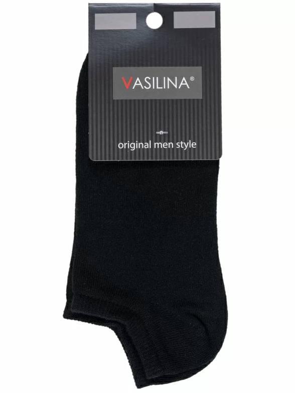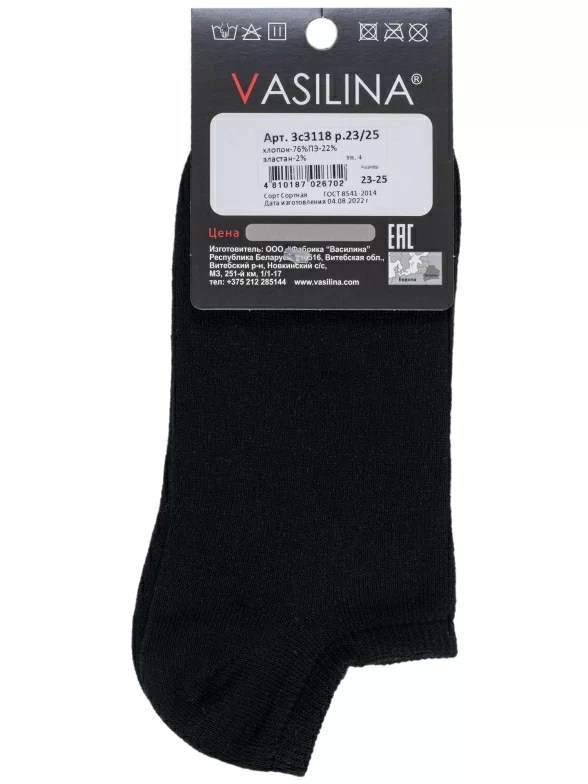 Летние ультракороткие мужские носки, цвет черный, классические, шов обычный (не бесшовные), принт (рисунок): без рисунков/узоров, однотонный, состав: 76% хлопок, 22% полиэстер, 2% эластан, арт. 3С3118. Производитель «ООО Фабрика Василина, Беларусь» под брендом «Vasilina».