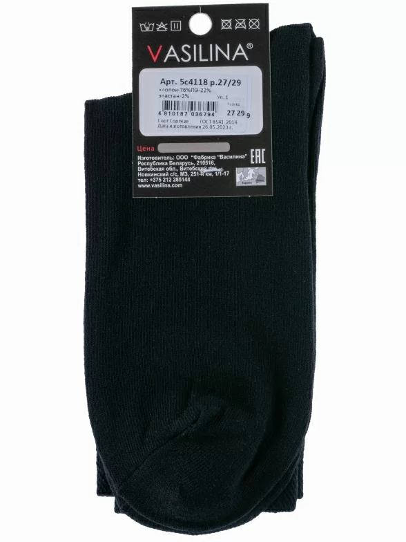 Круглогодичные средней длины мужские носки, цвет черный, классические, шов обычный (не бесшовные), принт (рисунок): однотонный, небольшой рисунок, состав: 76% хлопок, 22% полиэстер, 2% эластан, арт. 5С4118. Производитель «ООО Фабрика Василина, Беларусь» под брендом «Vasilina».