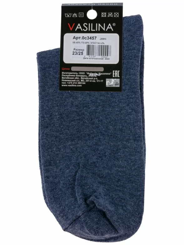 Круглогодичные укороченные мужские носки, цвет синий-джинс, классические, шов обычный (не бесшовные), принт (рисунок): однотонный, небольшой рисунок, состав: 40% хлопок, 58% полиэстер, 2% эластан, арт. 0С3457. Производитель «ООО Фабрика Василина, Беларусь» под брендом «Vasilina».