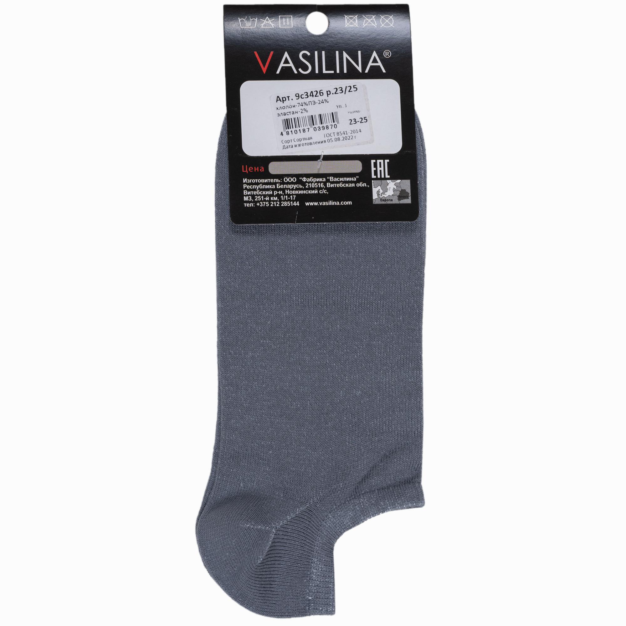Летние ультракороткие мужские носки, цвет серый, классические, шов обычный (не бесшовные), принт (рисунок): однотонный, без рисунков/узоров, состав: 74% хлопок, 24% полиэстер, 2% эластан, арт. 9С3426. Производитель «ООО Фабрика Василина, Беларусь» под брендом «Vasilina».