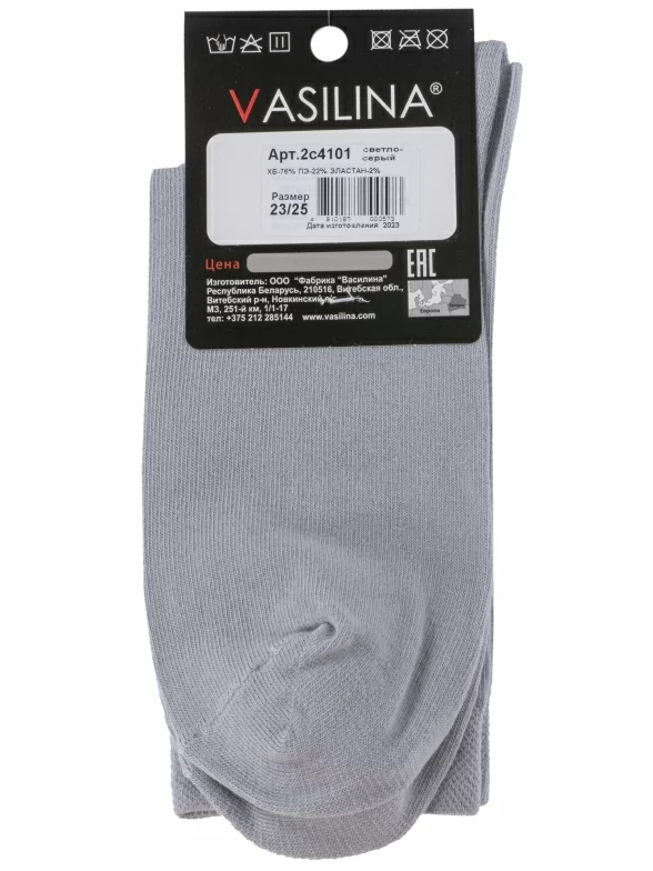 Круглогодичные средней длины мужские носки, цвет светло-серый, классические, шов обычный (не бесшовные), принт (рисунок): однотонный, небольшой рисунок, состав: 76% хлопок, 22% полиэстер, 2% эластан, арт. 2С4101. Производитель «ООО Фабрика Василина, Беларусь» под брендом «Vasilina».