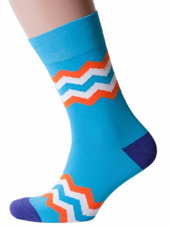 Круглогодичные средней длины мужские носки, цвет многоцветные (мультиколор)-голубой, повседневные, шов обычный (не бесшовные), принт (рисунок): полоски, зигзаг / молния, состав: 82% хлопок, 15% полиамид, 3% эластан, арт. Nm-41. Производитель «ИП Рыбалкин В.С., Московская область, г. Щелково» под брендом «Msclub».