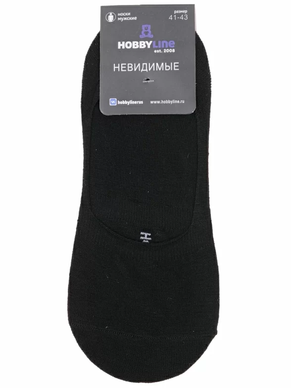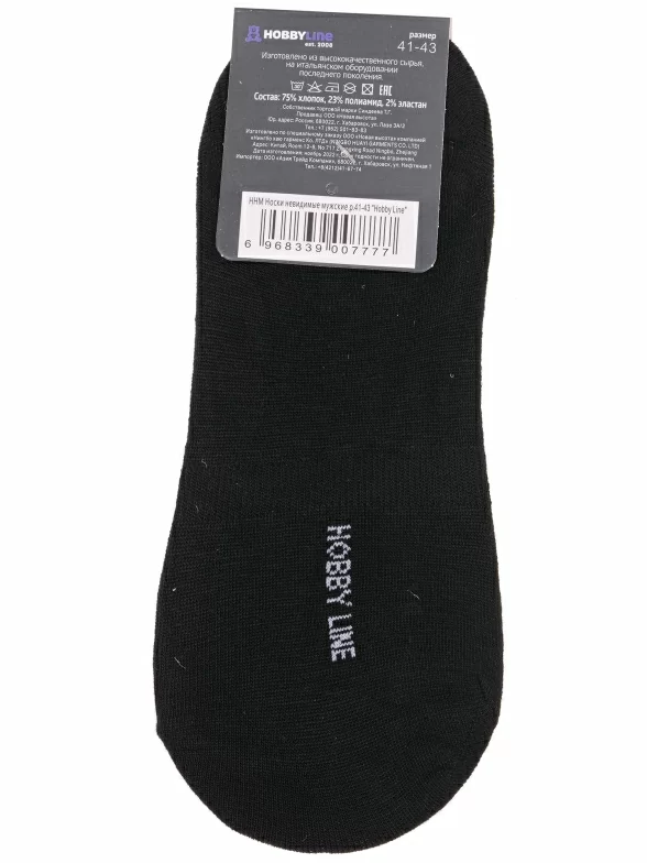 Летние мужские подследники, цвет черный, с силиконовой вставкой, классические, шов обычный (не бесшовные), принт (рисунок): однотонный, без рисунков/узоров, состав: 75% хлопок, 23% полиамид, 2% эластан, арт. ННМ. Производитель «Китай, страна бренда - Россия» под брендом «Hobby line».