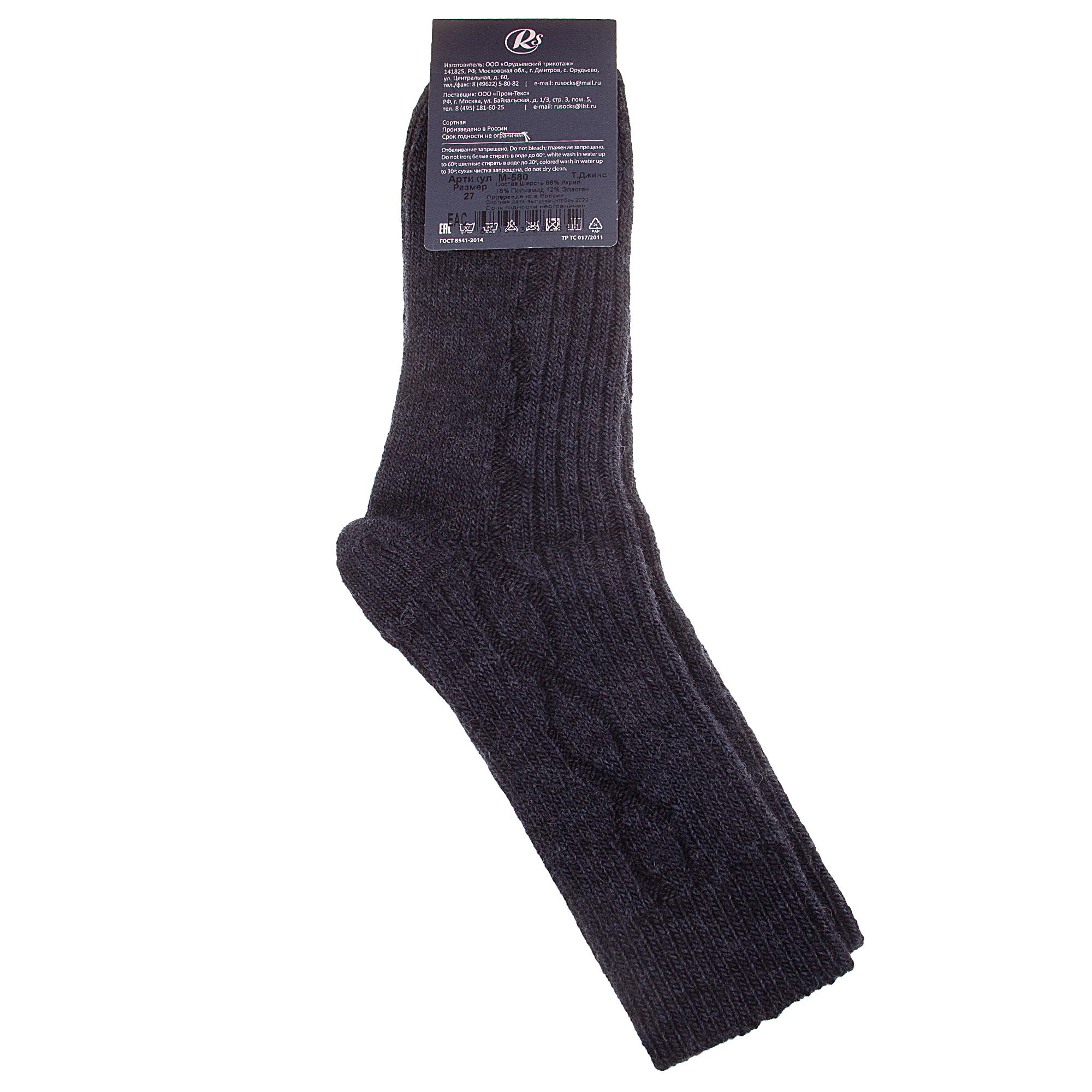 Зимние укороченные мужские носки, цвет джинс, теплые, классические, состав: 10% шерсть, 85% акрил, 4% полиамид, 1% эластан (на этикетках может быть указан неактуальный состав), арт. М-580. Производитель «ООО Орудьевский трикотаж, Россия» под брендом «Rusocks (орудьевский трикотаж)».