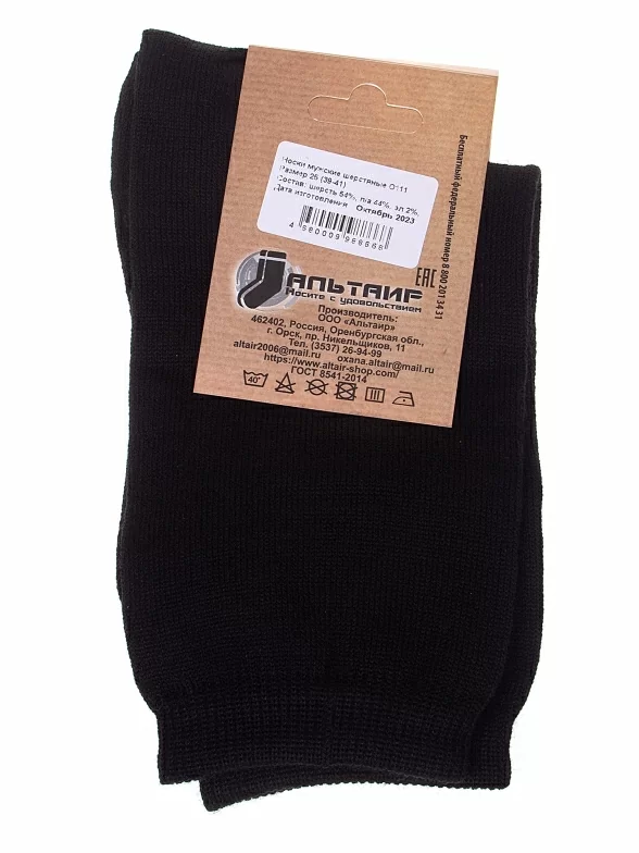 Зимние укороченные мужские носки, цвет черный, теплые, классические, шов обычный (не бесшовные), принт (рисунок): однотонный, без рисунков/узоров, состав: 54% шерсть, 44% полиамид, 2% эластан, арт. О111. Производитель «ООО Альтаир, г. Орск, Оренбургская обл, Россия» под брендом «Альтаир».