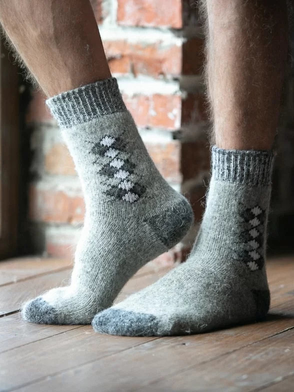 Бабушкины носки изготовлены из мягкой новозеландской овечьей шерсти, козьей шерсти и шерсти мериносов. В состав пряжи добавлено небольшое количество полиамида, который делает носки прочнее Для производства используются итальянские станки BUSI GIOVANNI. Модель связана в однотонном сером цвете и имеет геометрический узор с ромбами.