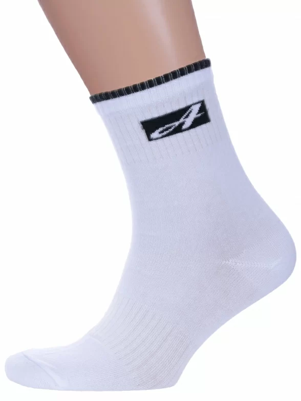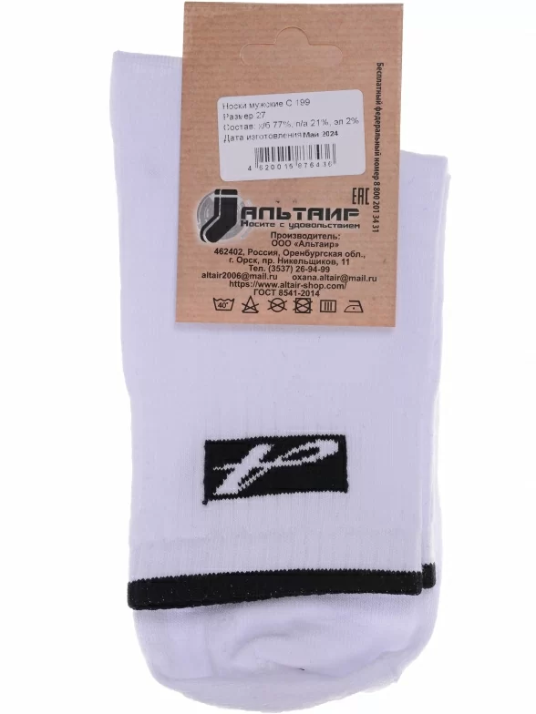Круглогодичные средней длины мужские носки, цвет белый, спортивные, шов обычный (не бесшовные), принт (рисунок): в рубчик, небольшой рисунок, состав: 77% хлопок, 21% полиамид, 2% эластан, арт. С199. Производитель «ООО Альтаир, г. Орск, Оренбургская обл, Россия» под брендом «Альтаир».