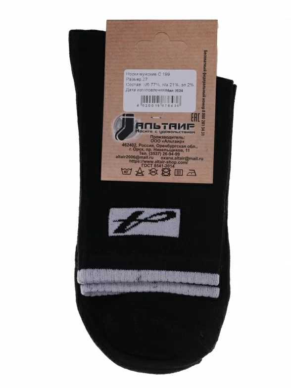 Круглогодичные средней длины мужские носки, цвет черный, спортивные, шов обычный (не бесшовные), принт (рисунок): в рубчик, небольшой рисунок, состав: 77% хлопок, 21% полиамид, 2% эластан, арт. С199. Производитель «ООО Альтаир, г. Орск, Оренбургская обл, Россия» под брендом «Альтаир».