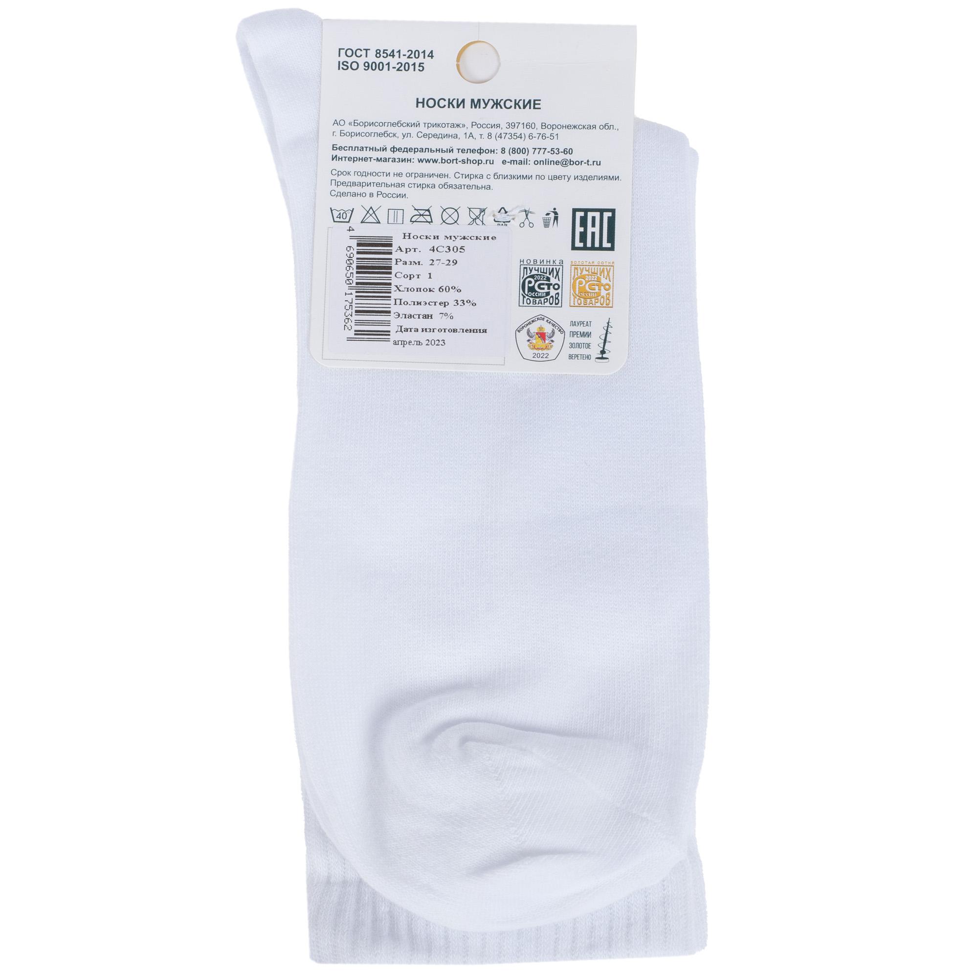 Круглогодичные средней длины мужские носки, цвет белый, спортивные, шов обычный (не бесшовные), принт (рисунок): в рубчик, однотонный, без рисунков/узоров, состав: 60% хлопок, 33% полиэстер, 7% эластан, арт. 4С305. Производитель «АО Борисоглебский трикотаж, Воронежская обл, Россия» под брендом «Борисоглебский трикотаж».