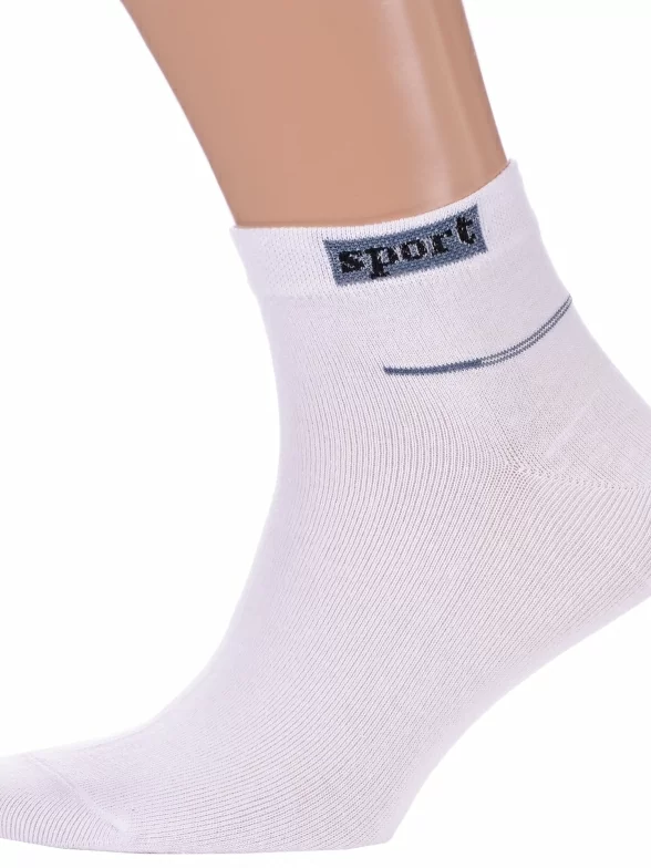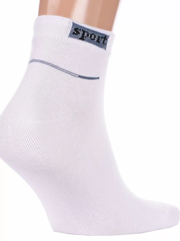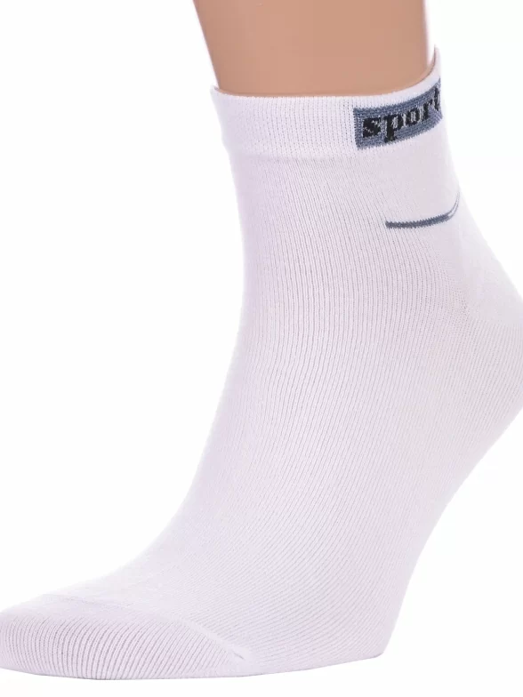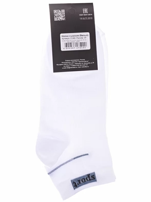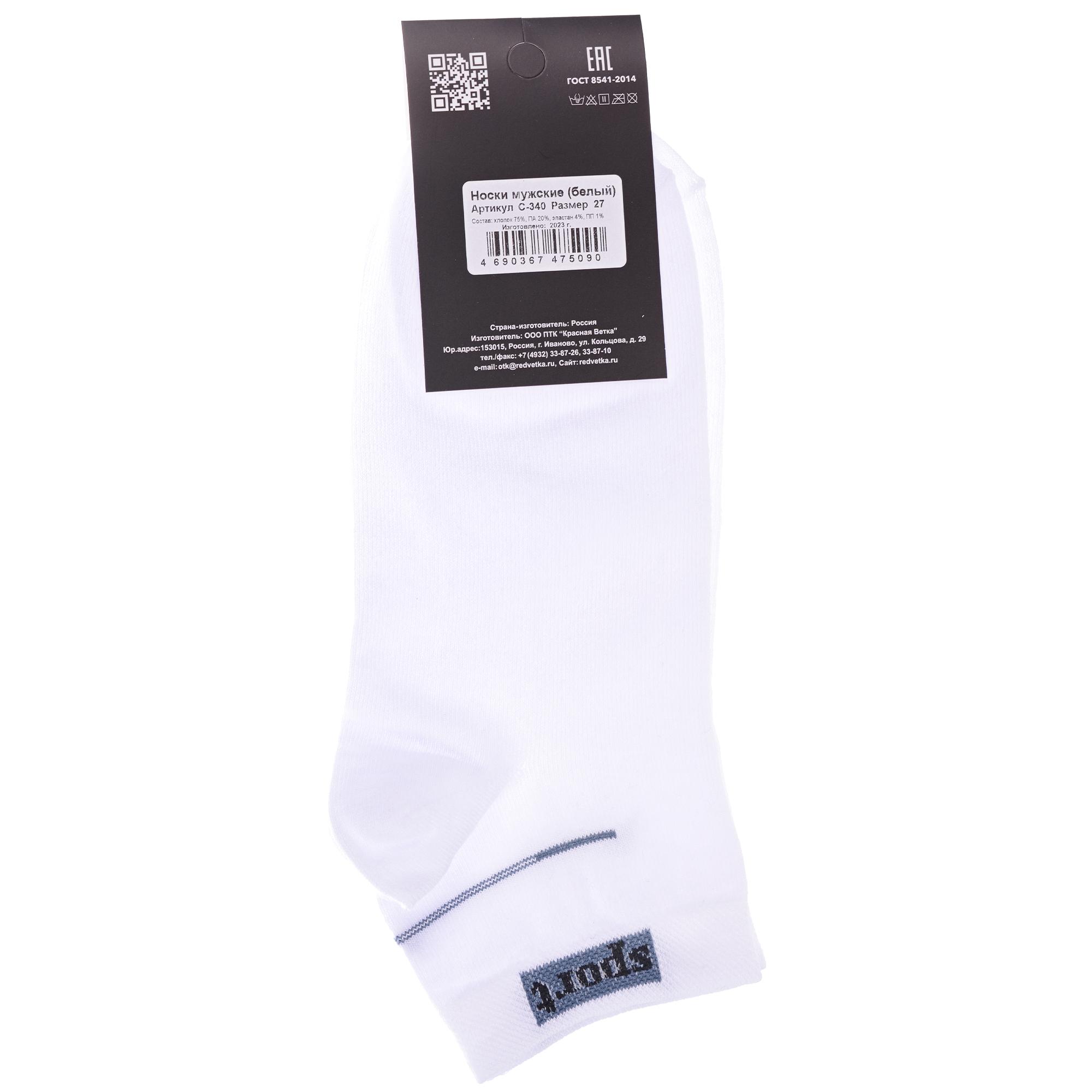 Круглогодичные укороченные мужские носки, цвет белый, спортивные, возможно бесшовные, принт (рисунок): спортивные, надписи, с узором, состав: 75% хлопок, 20% полиамид, 4% эластан, 1% полипропилен, арт. С-340. Производитель «КРАСНАЯ ВЕТКА» Россия под брендом «Красная ветка».