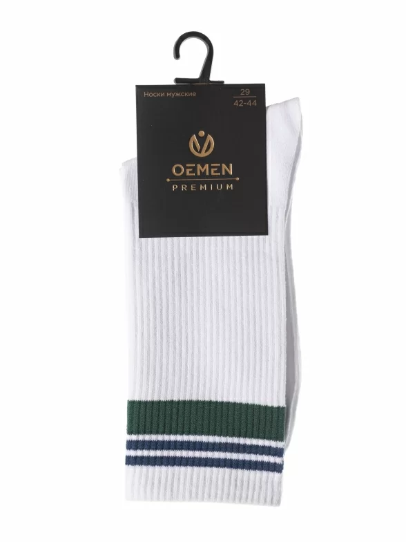 Круглогодичные средней длины мужские носки, цвет белый, спортивные, шов обычный (не бесшовные), принт (рисунок): полоски, в рубчик, состав: 80% хлопок, 17% полиамид, 3% лайкра, арт. PM485. Производитель «Oemen» Китай под брендом «Oemen».