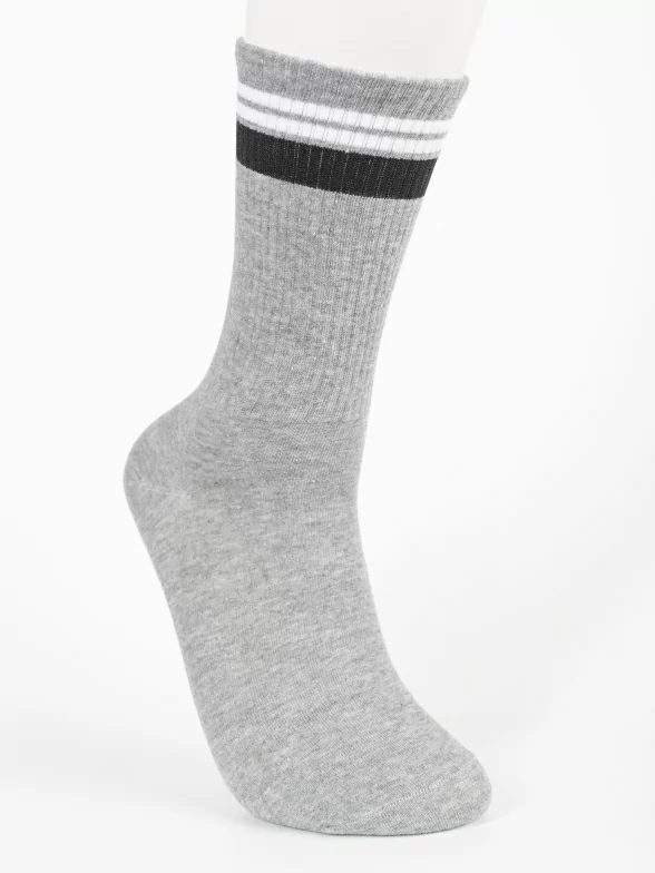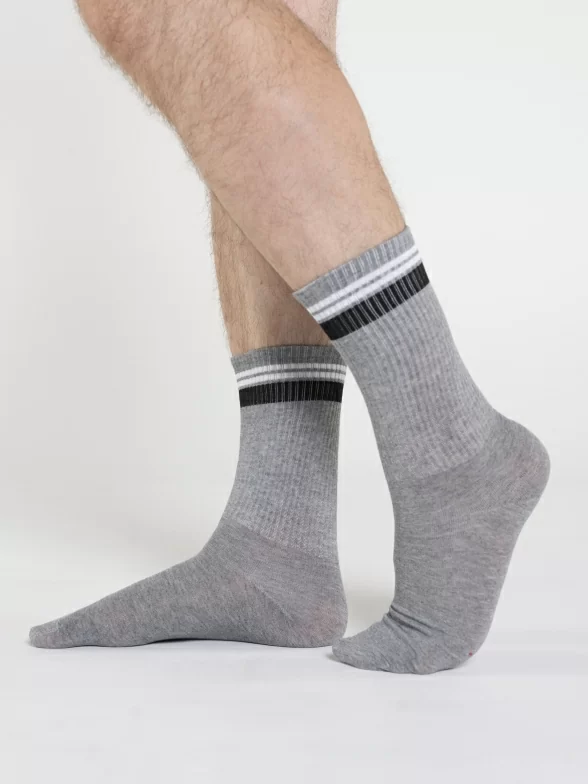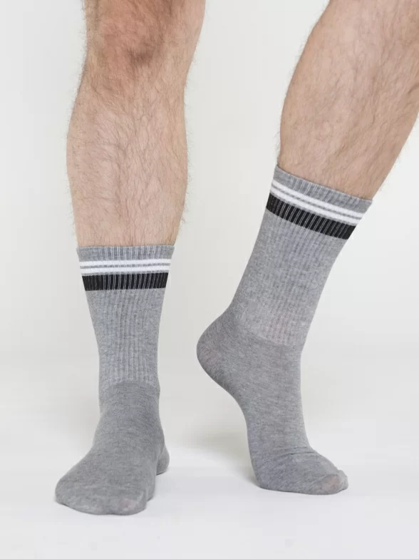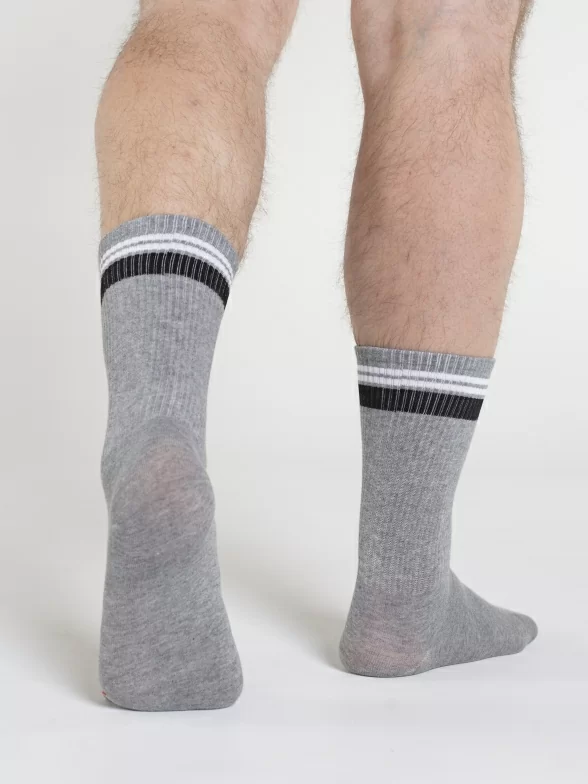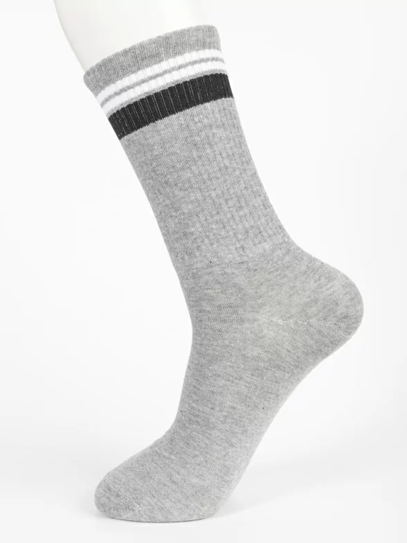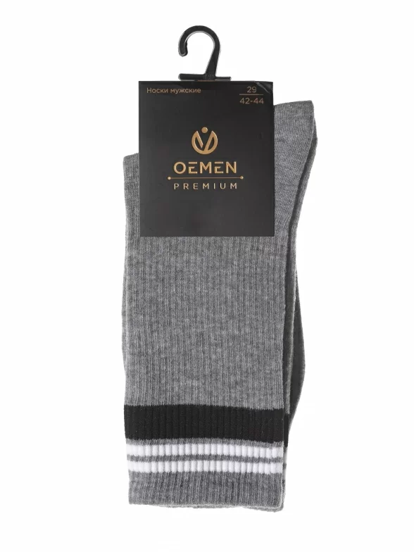 Круглогодичные средней длины мужские носки, цвет серый, спортивные, шов обычный (не бесшовные), принт (рисунок): полоски, в рубчик, состав: 80% хлопок, 17% полиамид, 3% лайкра, арт. PM485. Производитель «Oemen» Китай под брендом «Oemen».