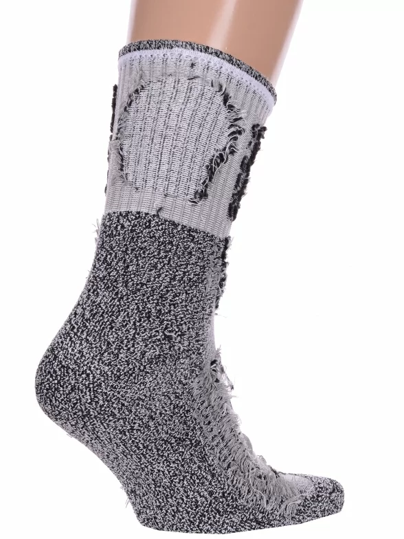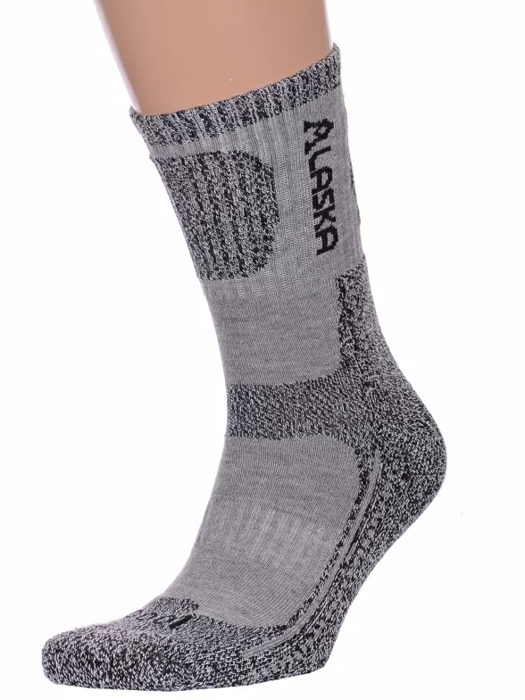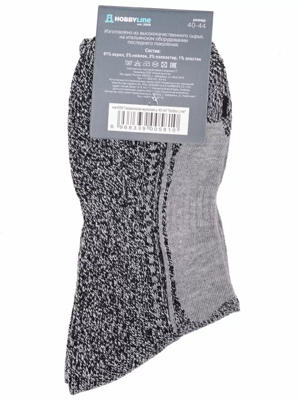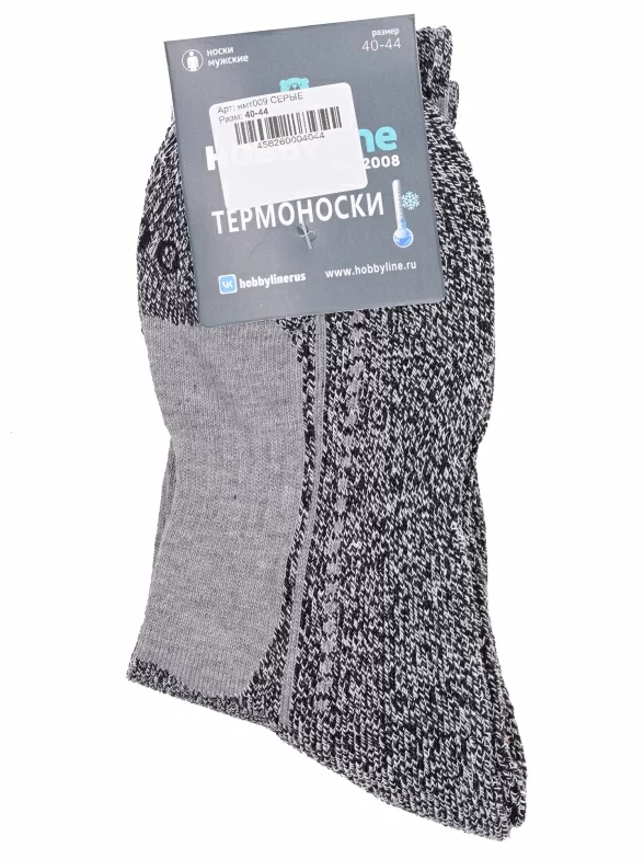 Зимние средней длины мужские носки, цвет серый, термоноски, теплые, спортивные, с махровым следом, шов обычный (не бесшовные), принт (рисунок): спортивные, надписи, с узором, состав: 91% акрил, 5% нейлон, 3% полиэстер, 1% эластан, арт. Нмт009. Производитель «Китай, страна бренда - Россия» под брендом «Hobby line».
