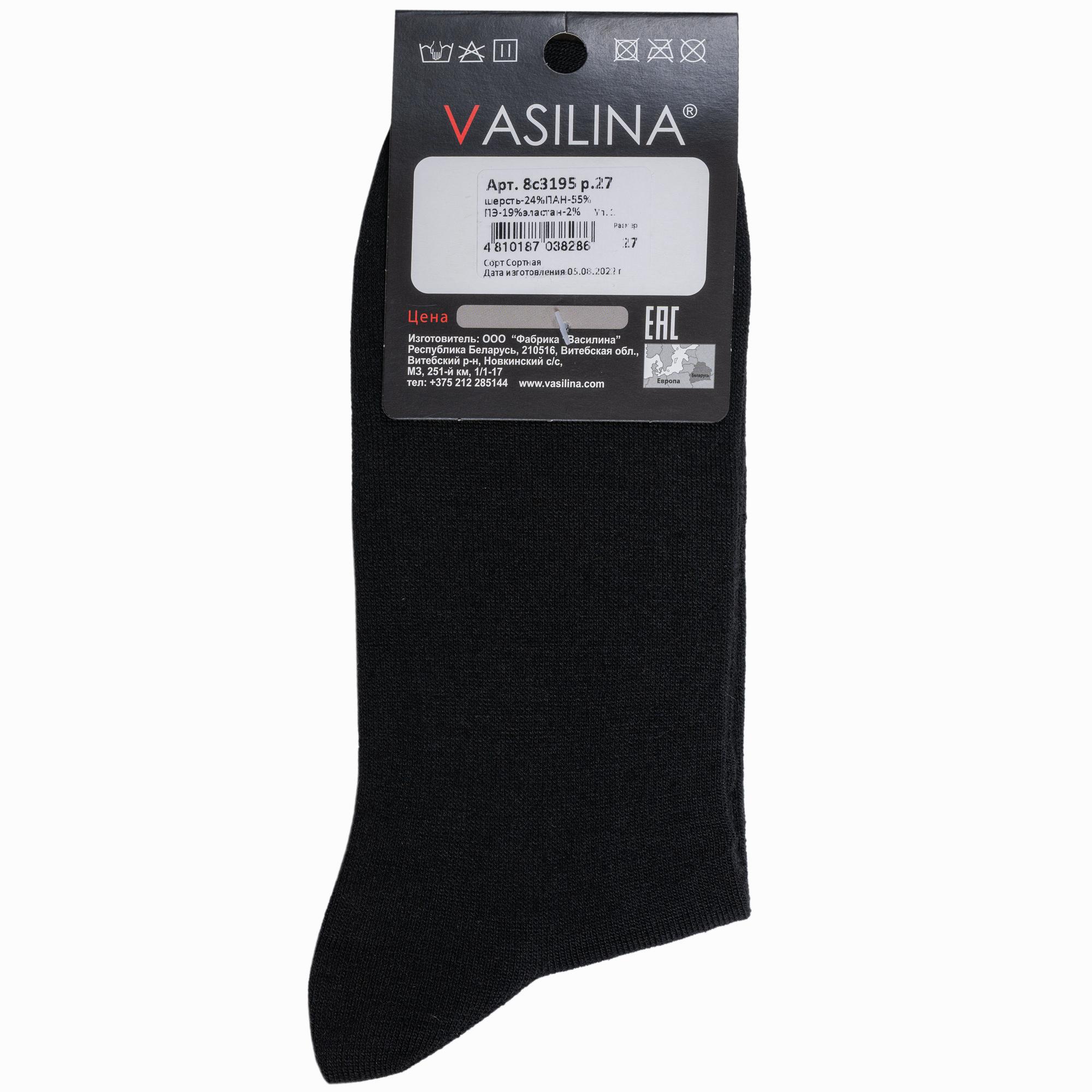 Зимние средней длины мужские носки, цвет черный, теплые, шов обычный (не бесшовные), принт (рисунок): однотонный, небольшой рисунок, состав: 24% шерсть, 55% ПАН, 19% полиэстер, 2% эластан, арт. 8С3195. Производитель «ООО Фабрика Василина, Беларусь» под брендом «Vasilina».
