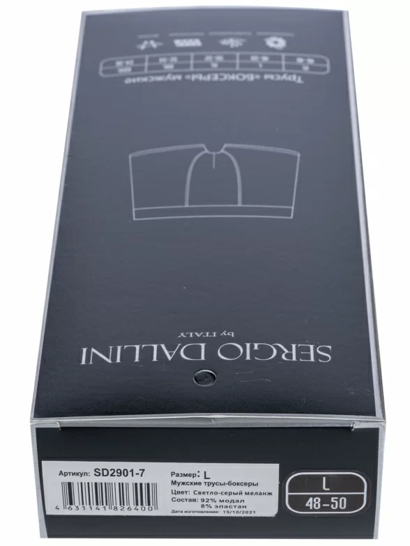 Трусы светло-серого меланжевого цвета арт. SD2901-7 поставляются в фирменной коробке с дополнительной защитой плотного транспортного картона. В зависимости от партии также возможна упаковка в фирменный пакет с зиплоком, либо в пакет с фирменной этикеткой.