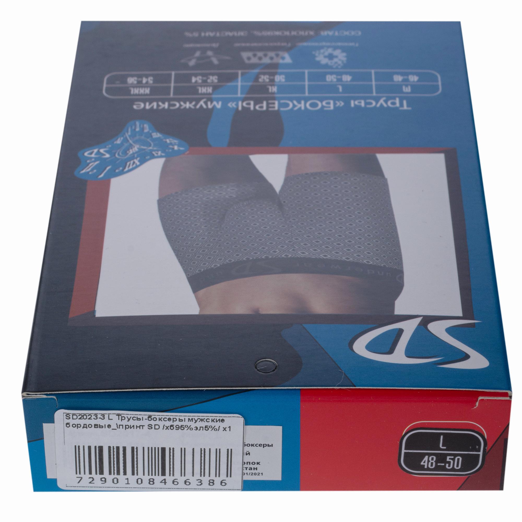 Трусы-боксеры бордового цвета артикула SD2023-3 поставляются в фирменной коробке или в прозрачном пакете с этикеткой.