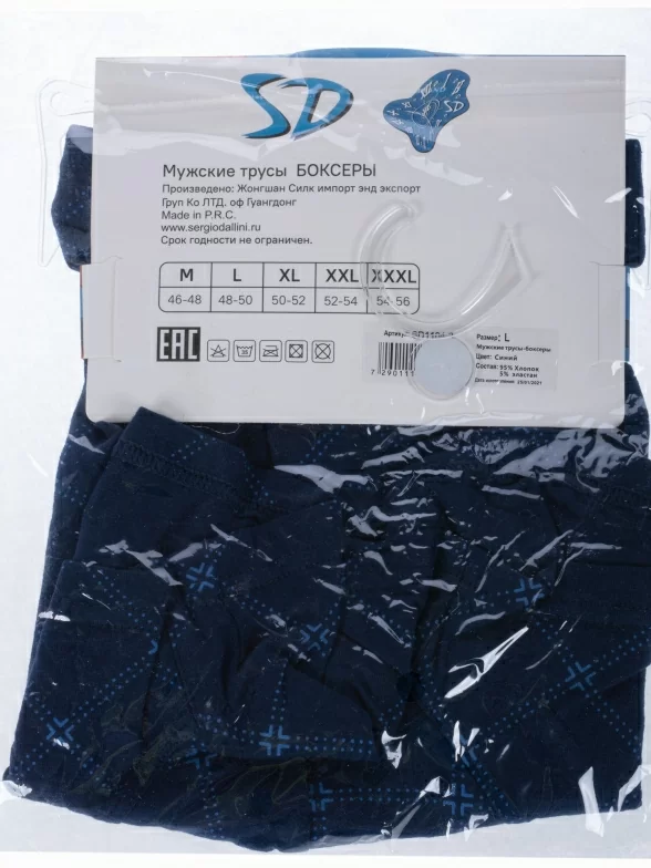 Трусы-боксеры синего цвета артикула SD1104-3 поставляются в фирменной коробке или в прозрачном пакете с этикеткой.