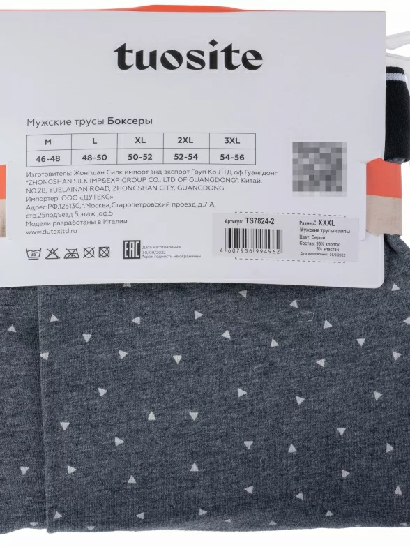 Трусы серого цвета артикула TS7824-2 поставляются в фирменной коробке с дополнительной упаковкой в плотный транспортный картон. В зависимости от партии также возможна упаковка в пакет с фирменной этикеткой.