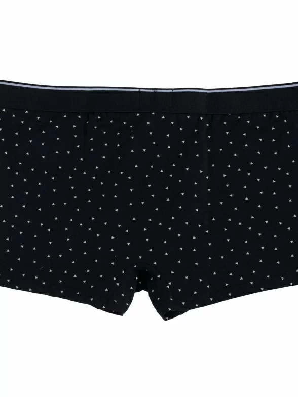 Обтягивающая модель стандартной посадки оформлена принтом в виде мелких треугольников, имеет эластичную резинку (3 см), с внутренней стороны место крепления пояса к основной части закрыто атласной лентой с логотипом бренда; боковые швы отсутствуют.