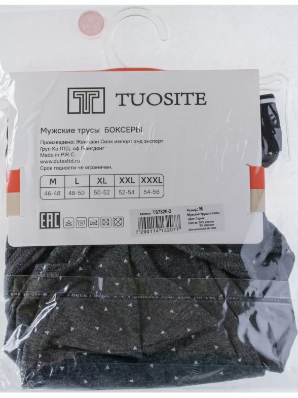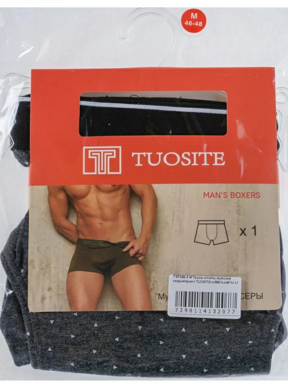 Трусы серого цвета арт. TS7826-2 в количестве одной штуки поставляются в фирменной коробке с дополнительной упаковкой в плотный транспортный картон. В зависимости от партии также возможна упаковка в пакет с фирменной этикеткой.