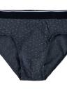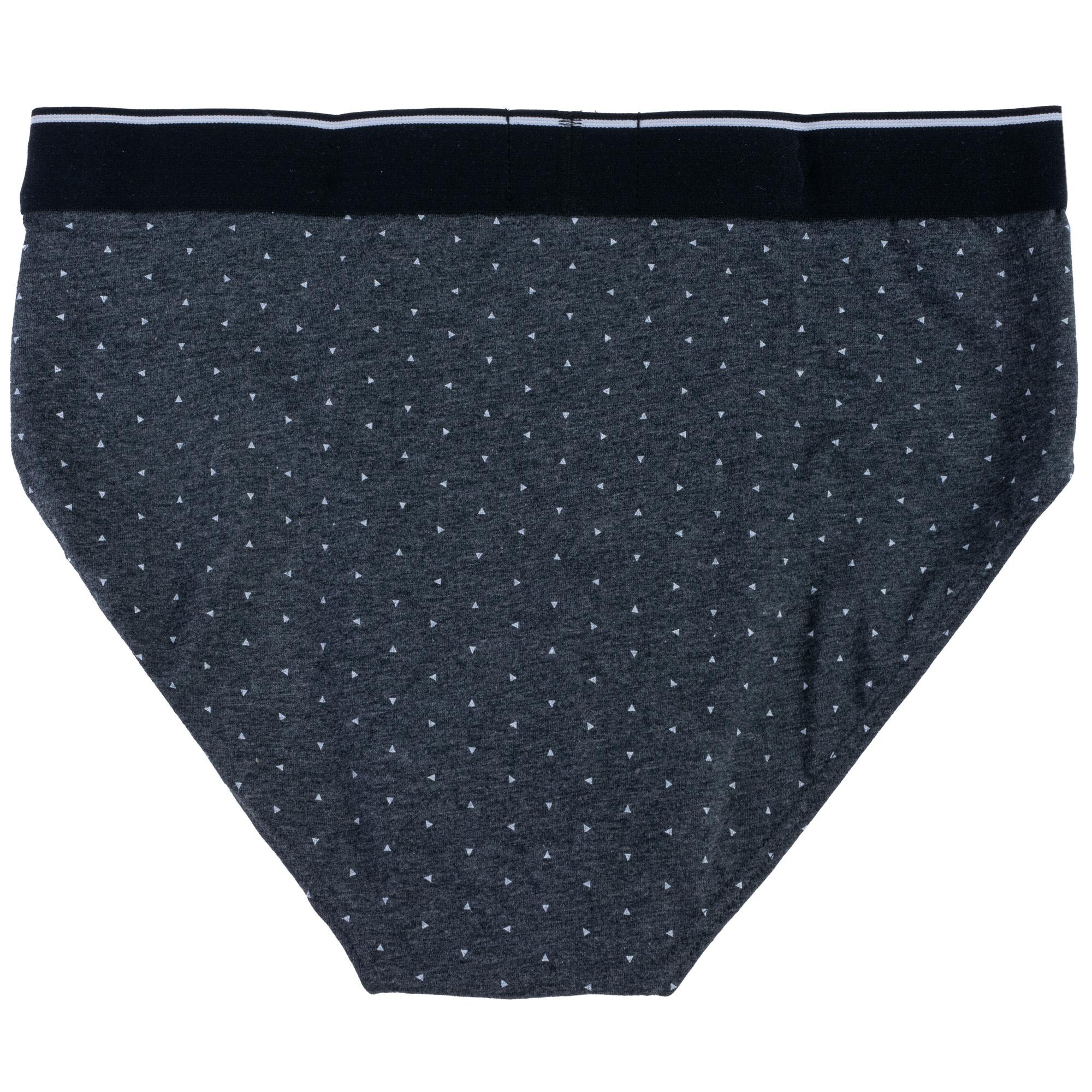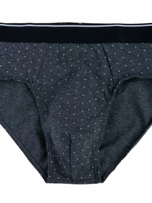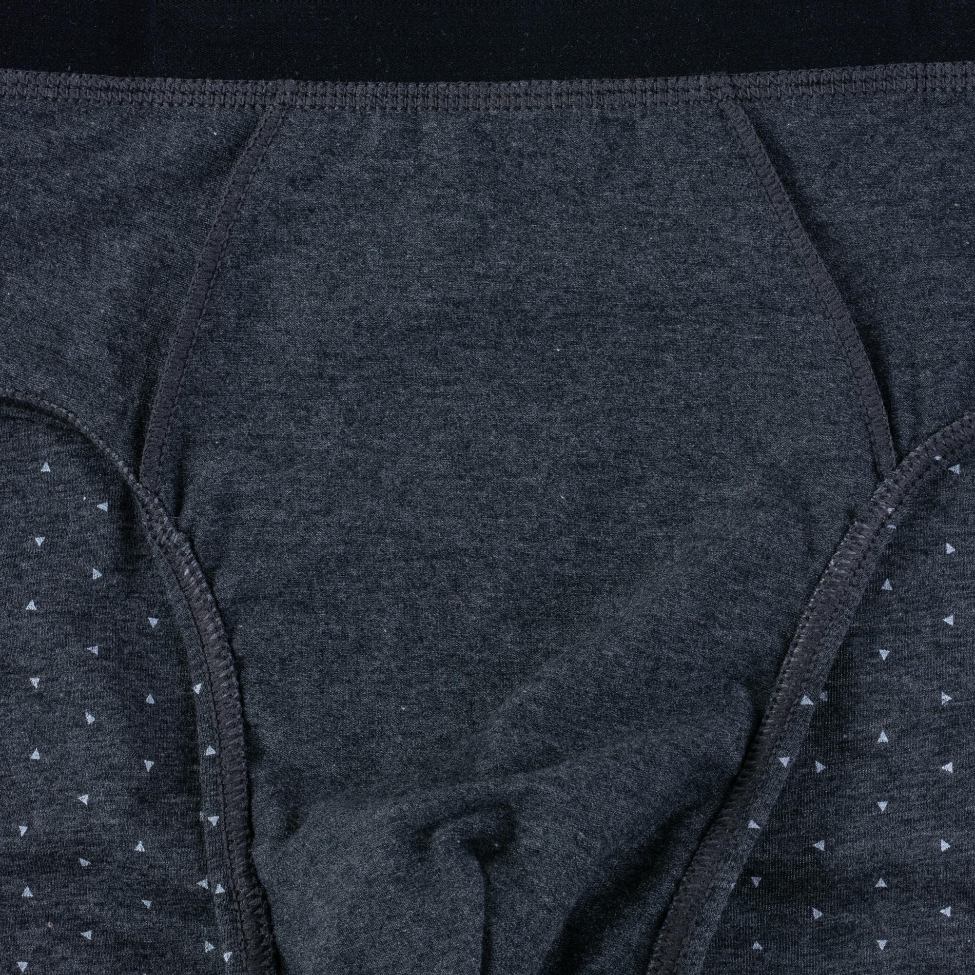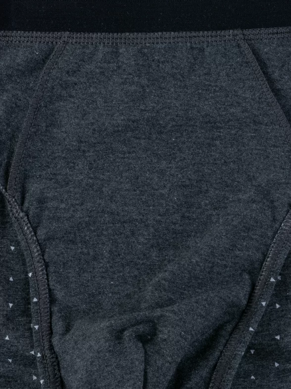 Обтягивающая модель стандартной посадки оформлена принтом в мелкий треугольник; имеет широкую эластичную резинку, пришитую накладным тройным швом и бочок средней ширины. Швы на гульфике спрятаны в двойную подкладку, а боковые швы отсутствуют.