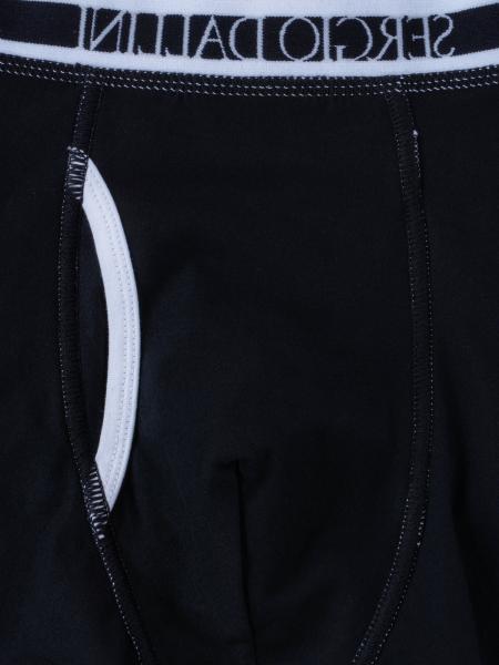 Однотонная обтягивающая модель стандартной посадки имеет широкую эластичную резинку, пришитую накладным тройным швом, украшенную логотипом бренда и бочок средней ширины. Швы на гульфике спрятаны в двойную подкладку, а боковые швы отсутствуют.