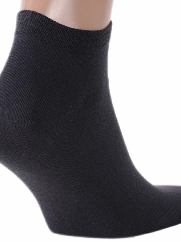 Летние короткие мужские носки, цвет темно-серый, спортивные, классические, шов кеттельный (бесшовная технология), принт (рисунок): однотонный, без рисунков/узоров, состав: 75% хлопок, 25% полиамид, арт. М-2212. Производитель «ООО Орудьевский трикотаж, Россия» под брендом «Rusocks (орудьевский трикотаж)».
