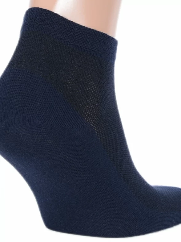 Летние короткие мужские носки, цвет темно-синий, в сеточку, спортивные, классические, шов кеттельный (бесшовная технология), принт (рисунок): однотонный, без рисунков/узоров, состав: 86% хлопок, 11% полиамид, 3% эластан, арт. М-237. Производитель «ООО Орудьевский трикотаж, Россия» под брендом «Rusocks (орудьевский трикотаж)».