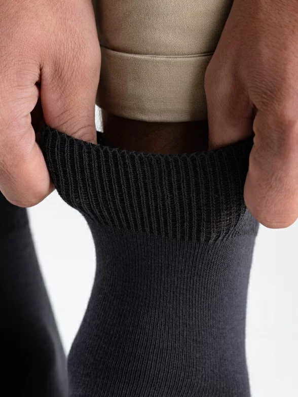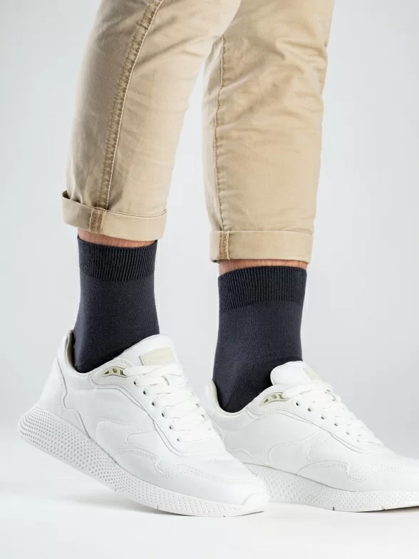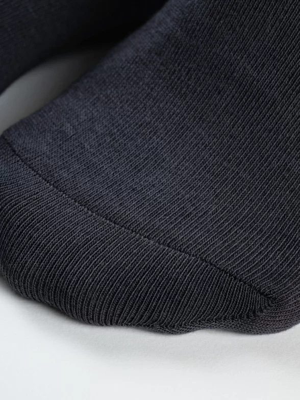 Укороченная модель с одинарным бортом (манжетом резинки) и обычным, ощутимым швом на мыске. Изготовлены на фабрике "Орудьевский трикотаж" в Московской области из хлопка с добавлением полиамида и эластана, которые обеспечивают износостойкость изделия и комфортную посадку. Процентное соотношение волокон: 88% хлопок, 10% полиамид, 2% эластан.