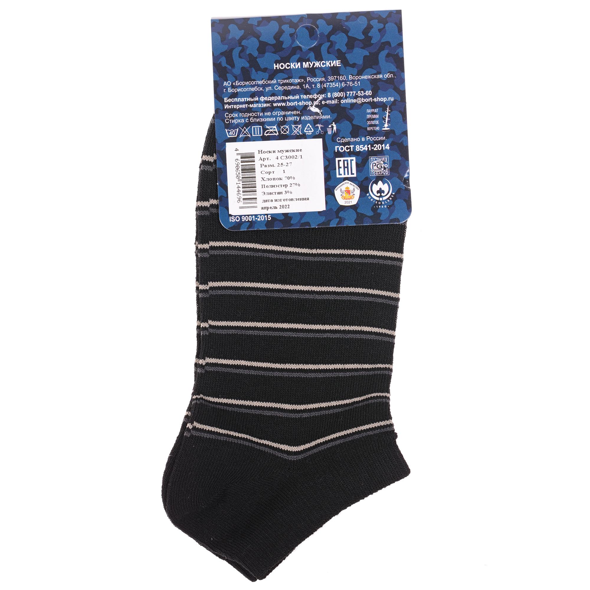 Летние ультракороткие мужские носки, цвет черный, повседневные, шов обычный (не бесшовные), принт (рисунок): полоски, с узором, состав: 70% хлопок, 27% полиэстер, 3% эластан, арт. 4С3002/1. Производитель «АО Борисоглебский трикотаж, Воронежская обл, Россия» под брендом «Борисоглебский трикотаж».