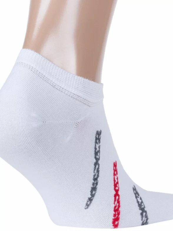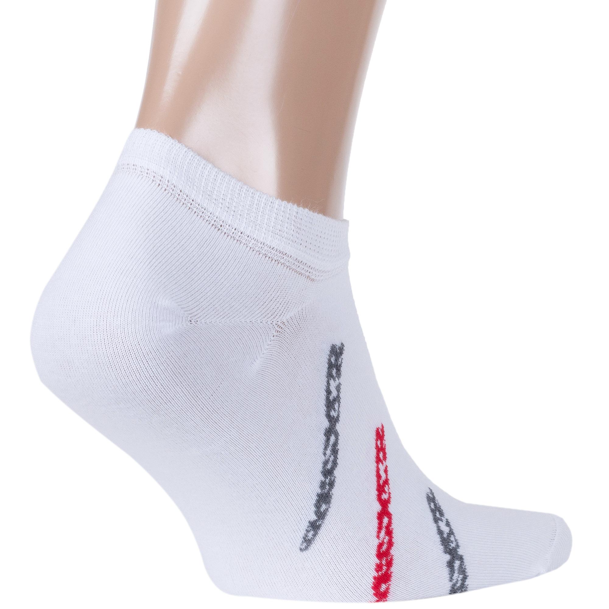 Летние ультракороткие мужские носки, цвет белый, спортивные, шов кеттельный (бесшовная технология), принт (рисунок): спортивные, полоски, с узором, состав: 80% хлопок, 15% полиамид, 5% эластан, арт. М3-23714. Производитель «ООО Орудьевский трикотаж, Россия» под брендом «Rusocks (орудьевский трикотаж)».