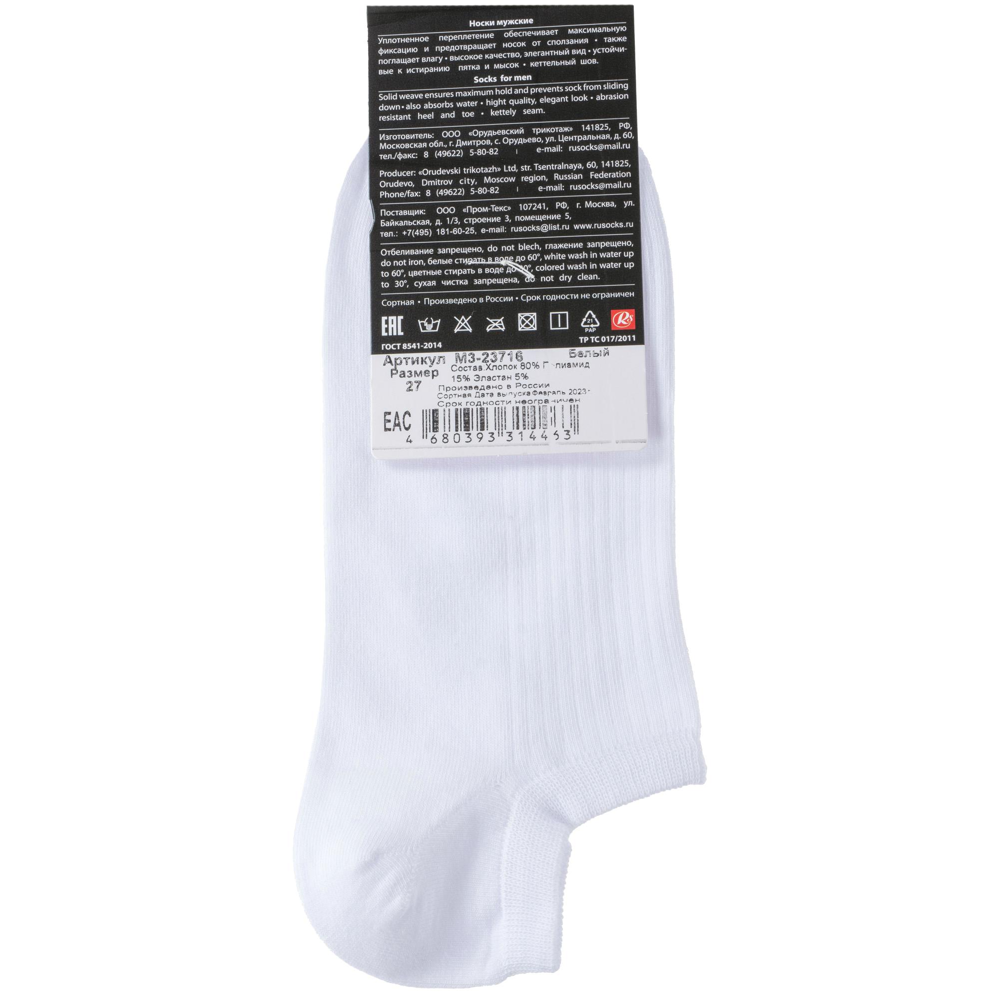Летние или круглогодичные ультракороткие мужские носки, цвет белый, классические, шов кеттельный (бесшовная технология), принт (рисунок): в рубчик, однотонный, без рисунков/узоров, состав: 80% хлопок, 15% полиамид, 5% эластан, арт. М3-23716. Производитель «ООО Орудьевский трикотаж, Россия» под брендом «Rusocks (орудьевский трикотаж)».