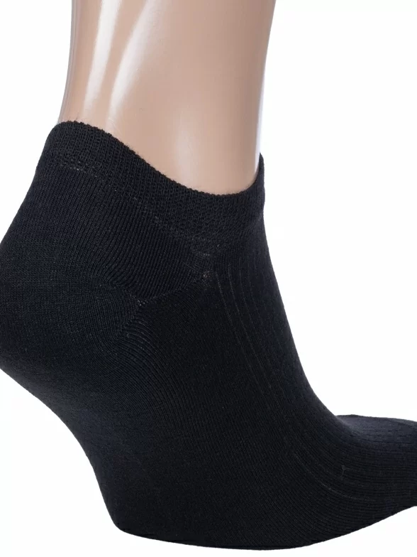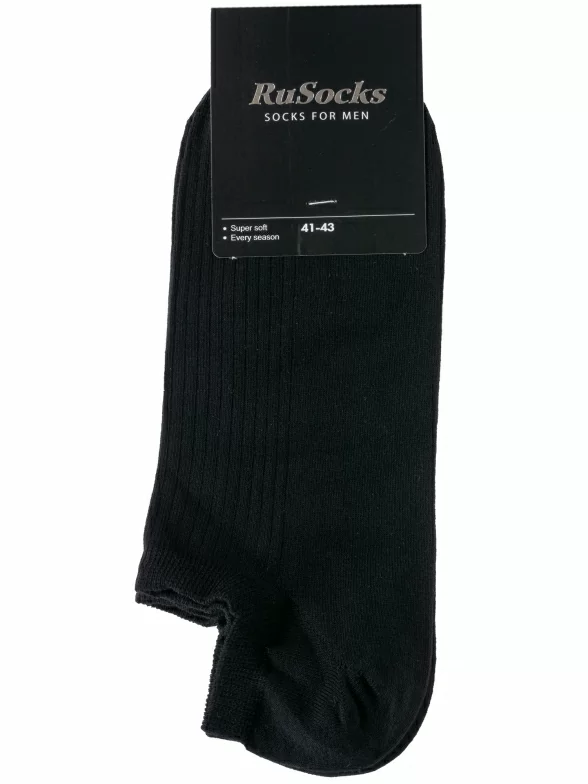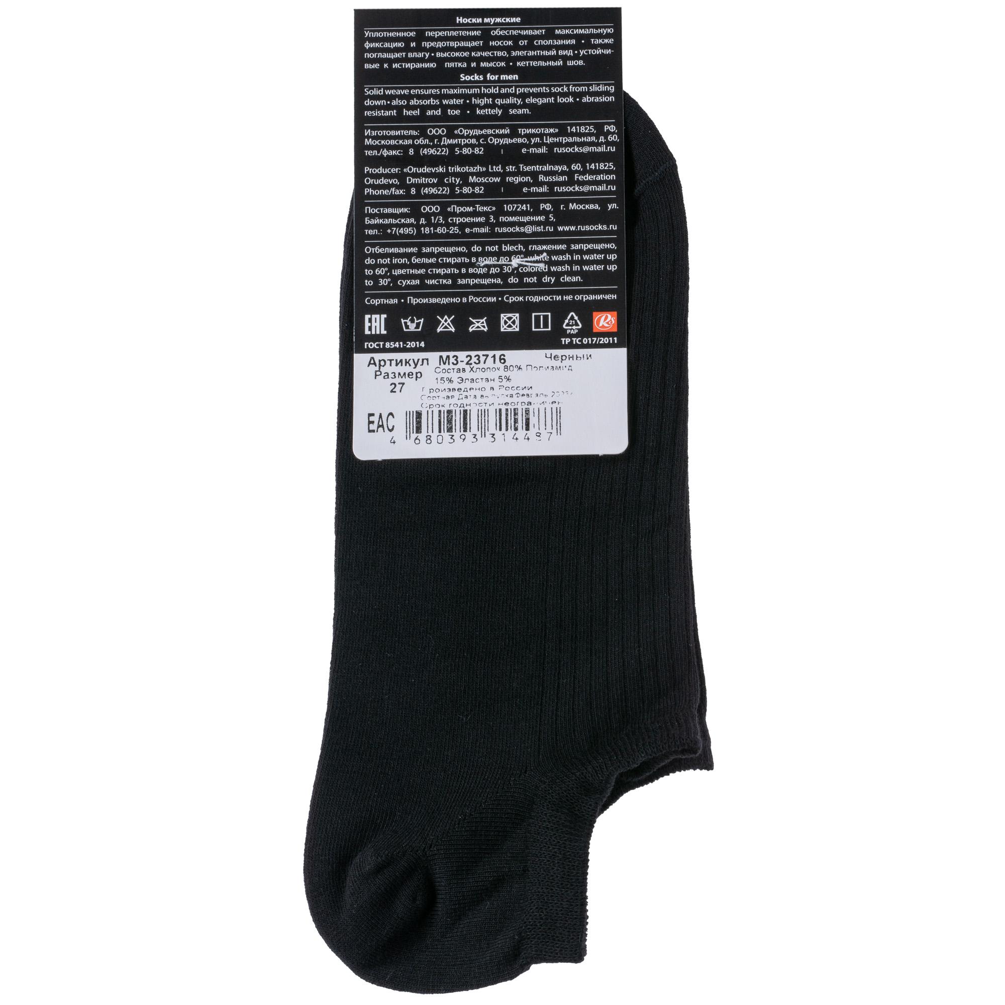 Летние или круглогодичные ультракороткие мужские носки, цвет черный, классические, шов кеттельный (бесшовная технология), принт (рисунок): в рубчик, однотонный, без рисунков/узоров, состав: 80% хлопок, 15% полиамид, 5% эластан, арт. М3-23716. Производитель «ООО Орудьевский трикотаж, Россия» под брендом «Rusocks (орудьевский трикотаж)».