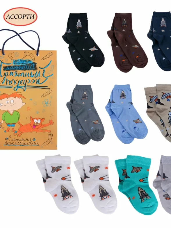 В комплект входят 10 пар носков с индивидуальными фабричными этикетками, к ним будет приложен забавный фирменный пакет, все вместе дополнительно упаковано в плотный транспортный картон для сохранности при доставке.