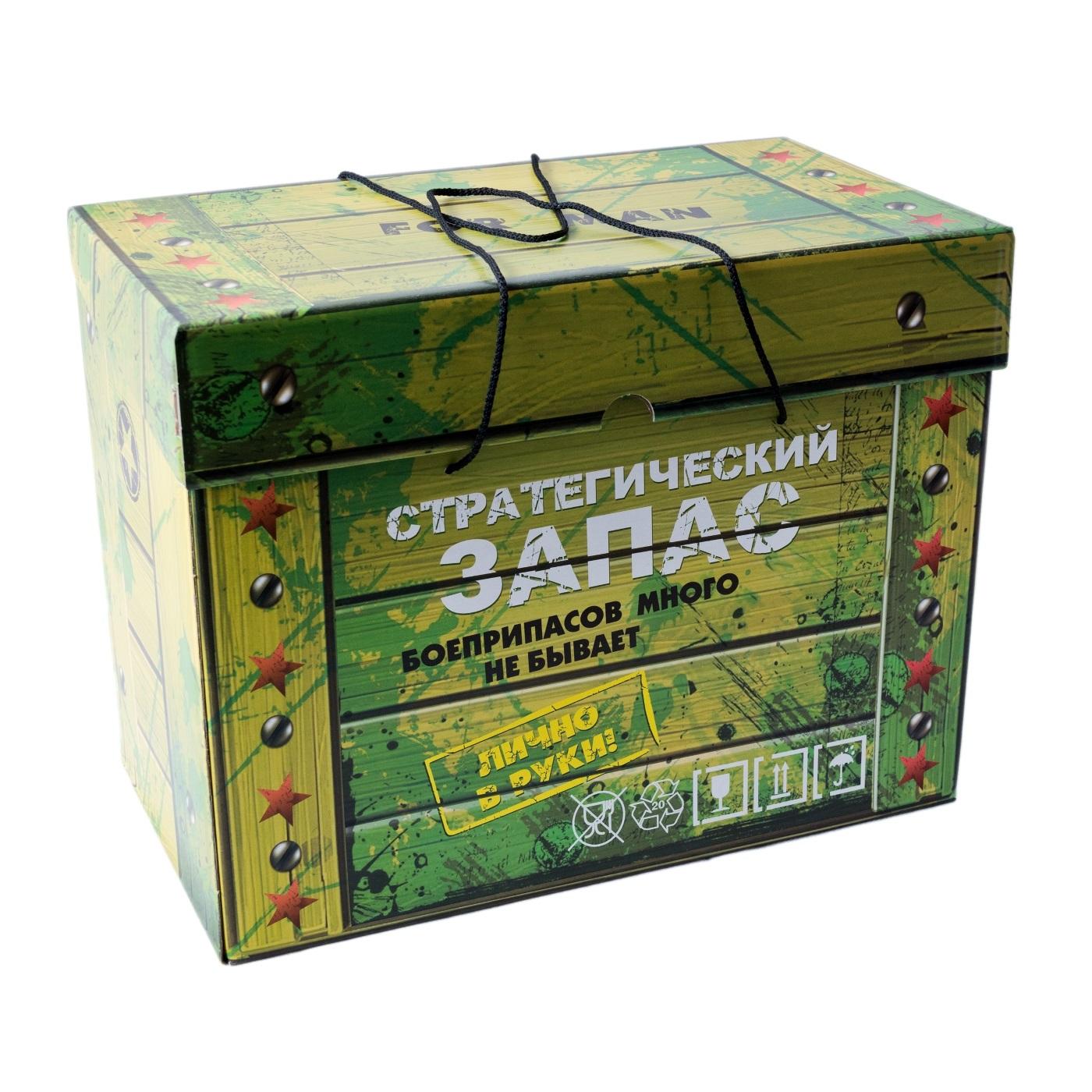 Носки компактно упакованы в красивую подарочную коробку с надписью "Стратегический запас" и с веревочными ручками, которая упаковывается в плотный картон, позволяющий избежать потертостей и вмятин.