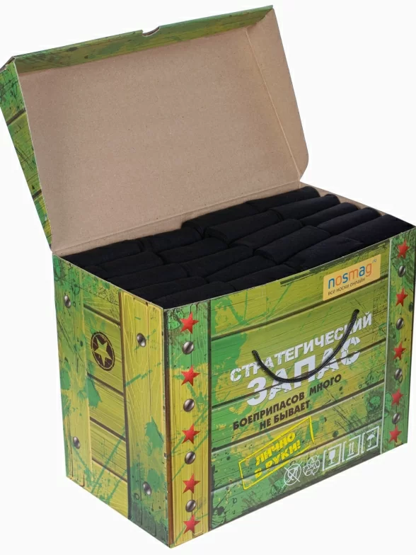 Носки без фабричных этикеток компактно упакованы внутри фирменной коробки с надписью "Стратегический запас", которая для сохранности помещается дополнительно в транспортный картон.