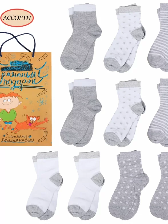 В комплект входят 10 пар носков с индивидуальными фабричными этикетками, к ним будет приложен забавный фирменный пакет, все вместе дополнительно упаковано в плотный транспортный картон для сохранности при доставке.