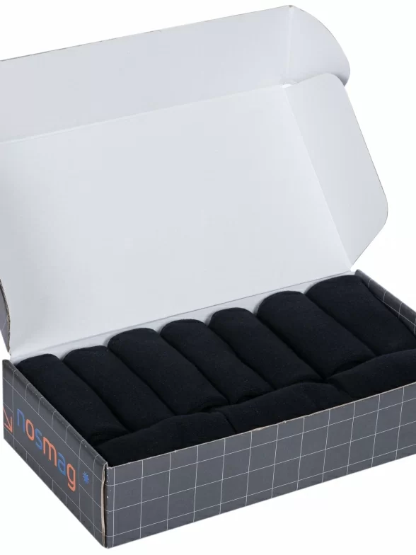 Все носки без фабричных этикеток свернуты аккуратными рулончиками внутри фирменной коробки, которая для сохранности упаковывается дополнительно в плотный транспортный картон.