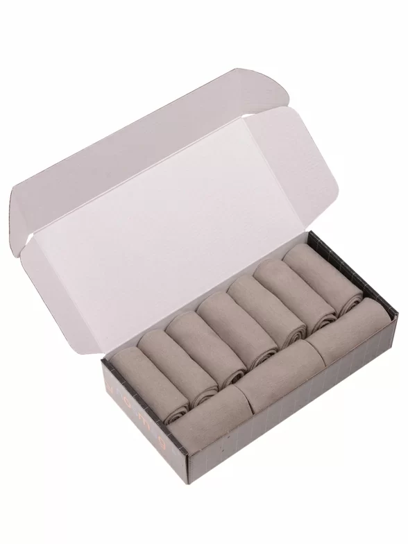 Все носки без фабричных этикеток свернуты аккуратными рулончиками внутри фирменной коробки, которая для сохранности упаковывается дополнительно в плотный транспортный картон.