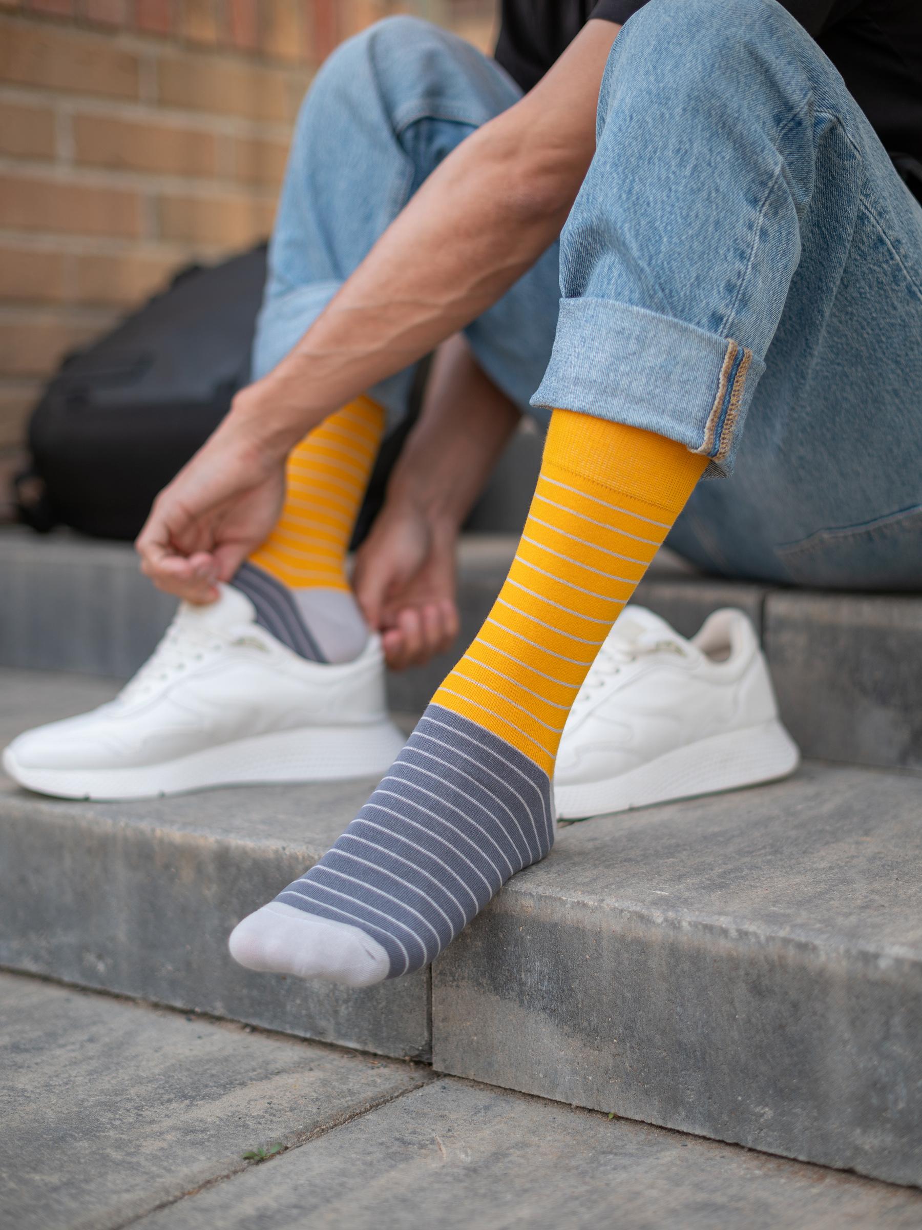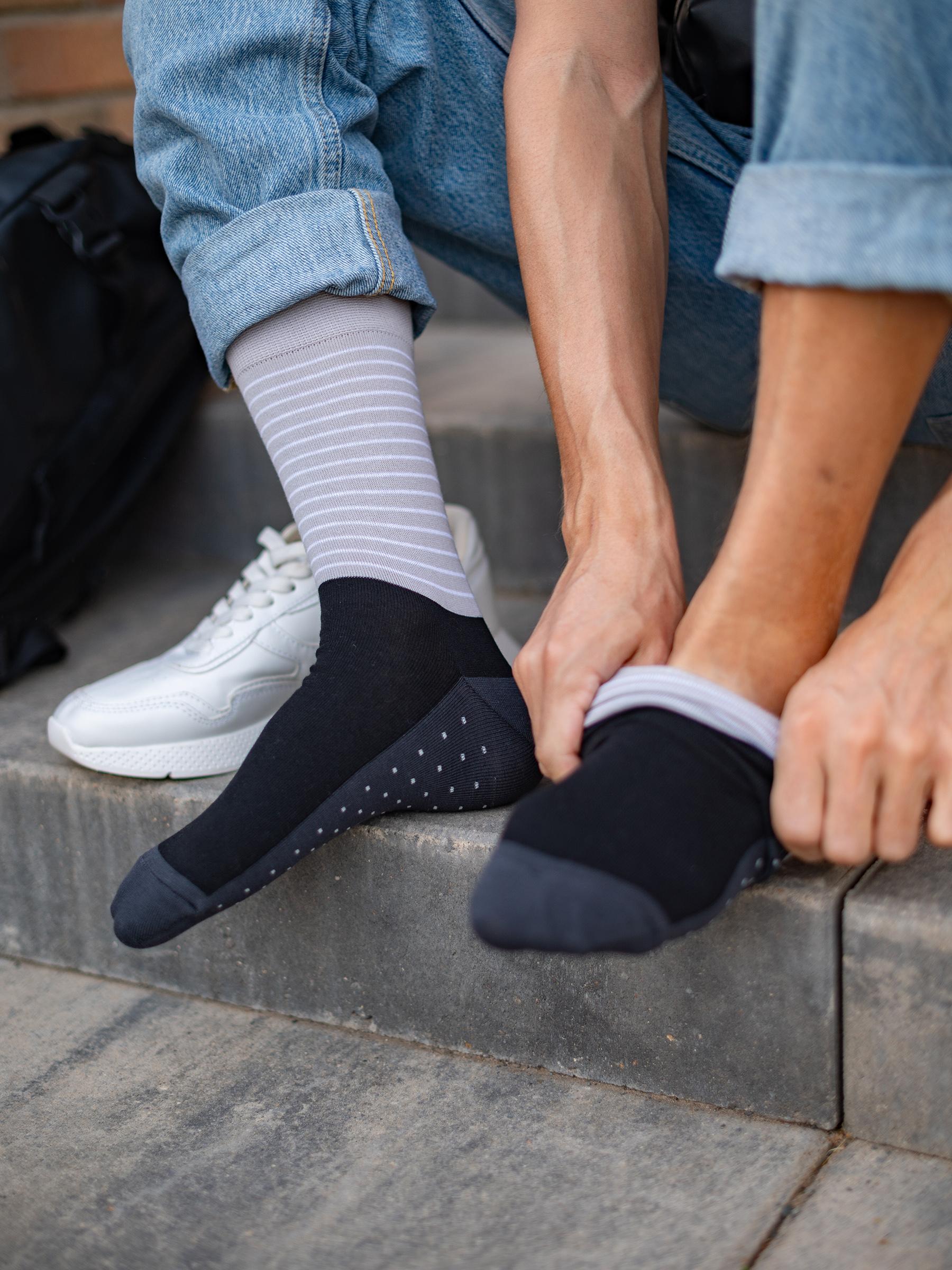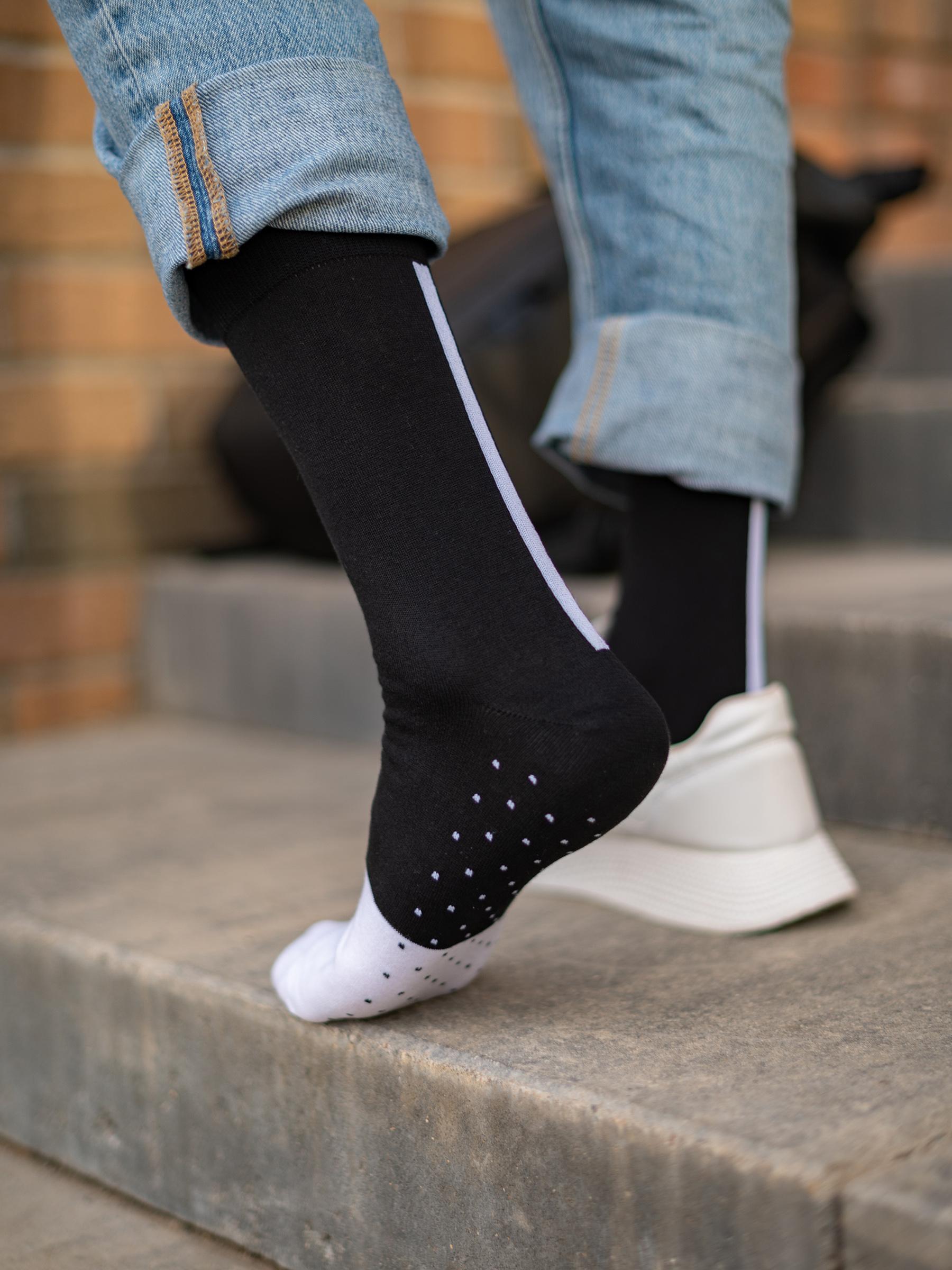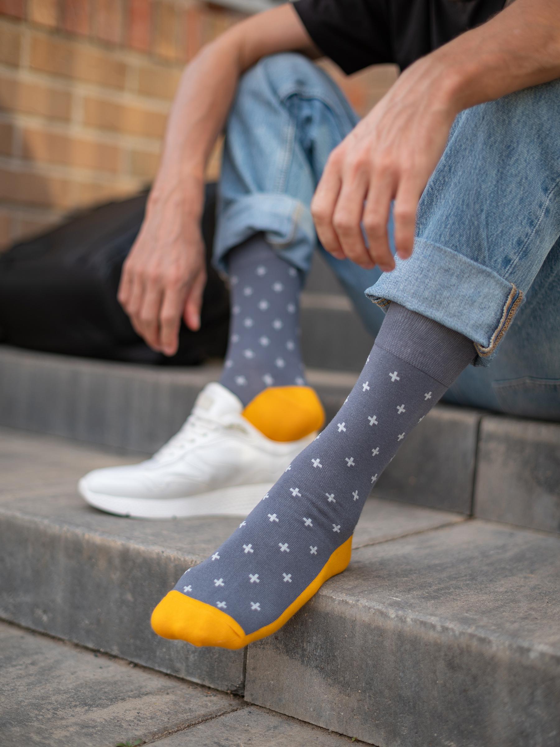 Набор из 10 разных пар хлопковых мужских носков с различными принтами.