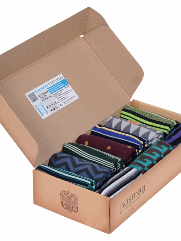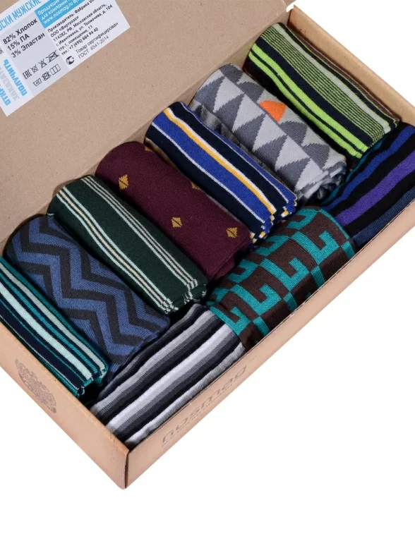 Комплект мужских качественных хлопковых носков пригодится каждому мужчине любого возраста. Носки связаны на известной российской фабрике МС Клаб c использованием современного оборудования. В наборе 10 пар носков в спокойных и ярких расцветках с контрастными геометрическими принтами, из которых 6 пар в полоску. Носки состоят на 82% из хлопка - они качественные, износостойкие и очень эластичные. Не теряют свою форму и цвет после многочисленных стирок. Удобная резинка не пережимает ногу в течение всего дня. Носки упакованы в стильную картонную коробку.