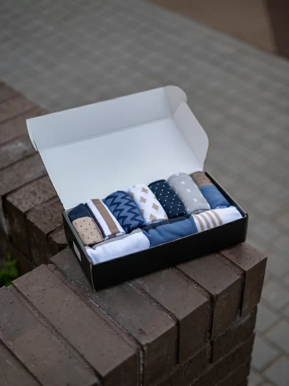 Носки компактно свернуты в аккуратные рулончики внутри стильной фирменной коробки. Для сохранности внешнего вида при транспортировке набор упаковывается в плотный картон.