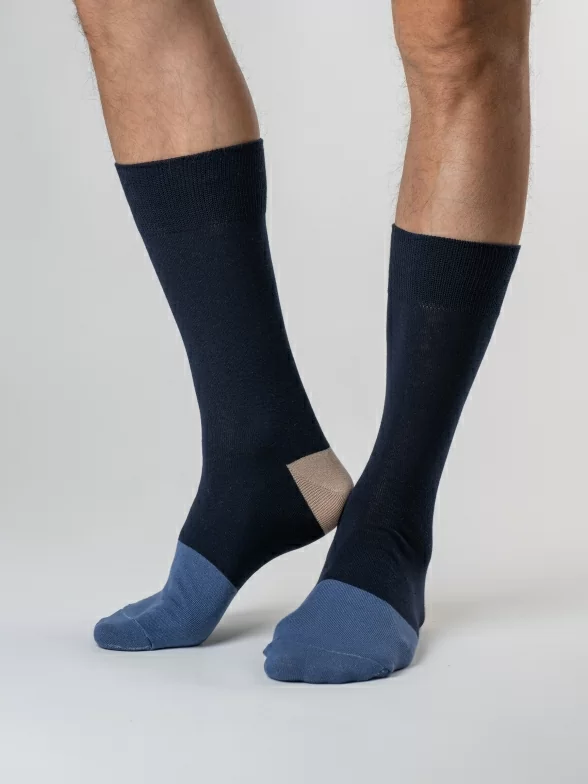 Носки вяжутся на российской фабрике МС Клаб на современных станках высокого класса (с плотностью вязки в 200 игл). Благодаря качественному оборудованию и оптимальному сочетанию гребенного хлопка и синтетических нитей эти носки износостойкие, гладкие и плотные. Двойной широкий борт не пережимает ногу, при этом надежно фиксирует носок на голени.