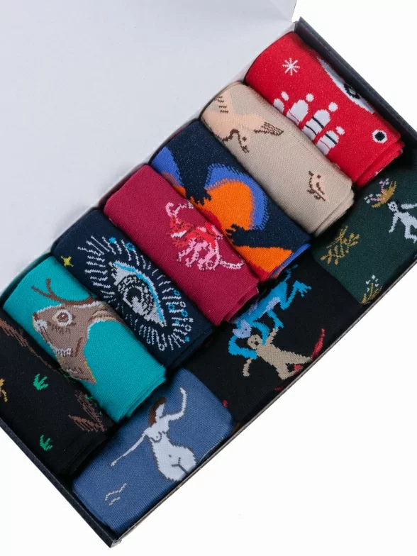 В этот набор MSCLUB входят 10 пар мужских носков в ярких и темных расцветках с оригинальными принтами, которые подойдут для необычного повседневного образа.