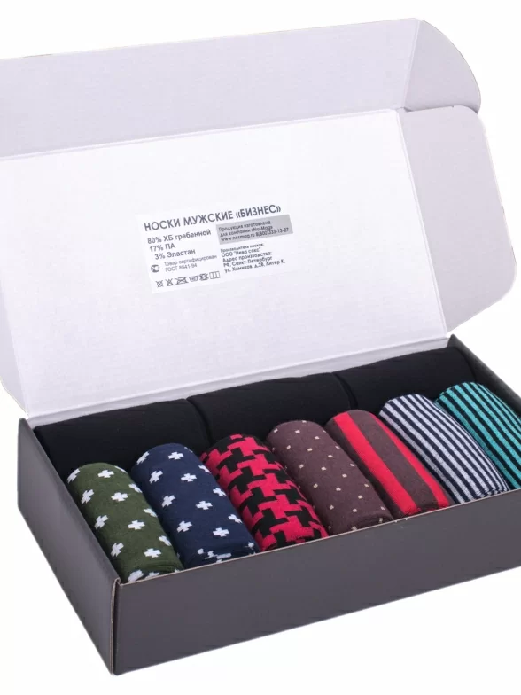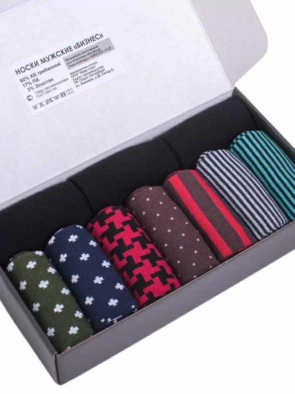 Набор состоит из 10 пар носков, из них 7 пар носков имеет классические принты и 3 пары классического черного цвета. Носки на 80% состоят из хлопка. Благодаря включению в состав небольшого количества синтетического волокна они остаются эластичными и не садится размер. Упакованы в стильную коробочку из ламинированного картона. Этот набор можно презентовать мужчине по любому торжественному случаю.