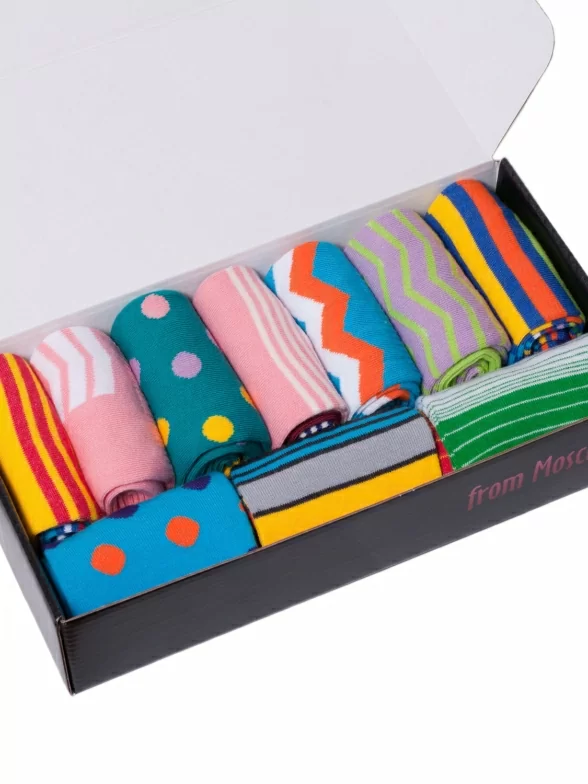 Носки компактно упакованы в красивую подарочную коробку. Для транспортировки коробка упаковывается в плотный картон, который помогает предотвратить возможную деформацию и потертости.