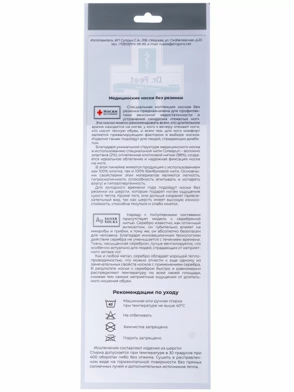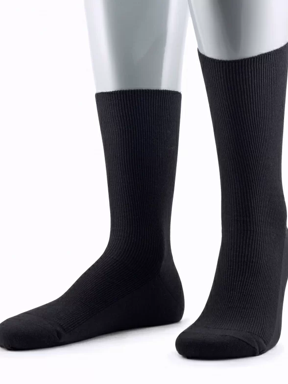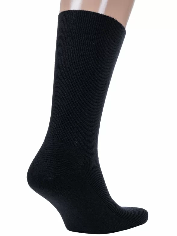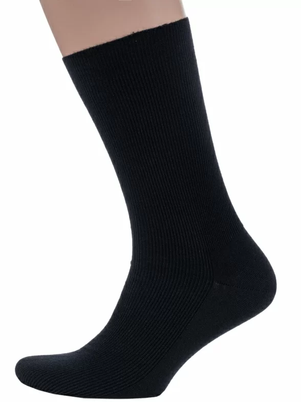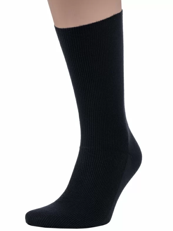 Модель средней длины с плоским малоощутимым швом на мыске и без резинки, благодаря чему носки не пережимают ногу и не нарушают кровообращение, а вязка в мелкий рубчик обеспечивает надежную фиксацию носка на ноге.