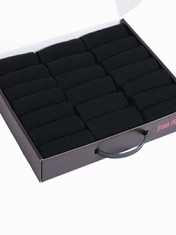 Набор из 20 пар черных однотонных мужских носков MSCLUB позволит надолго забыть о проблеме поиска пары одинаковых носков по утрам.