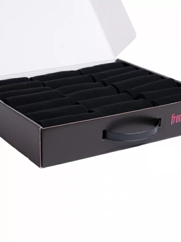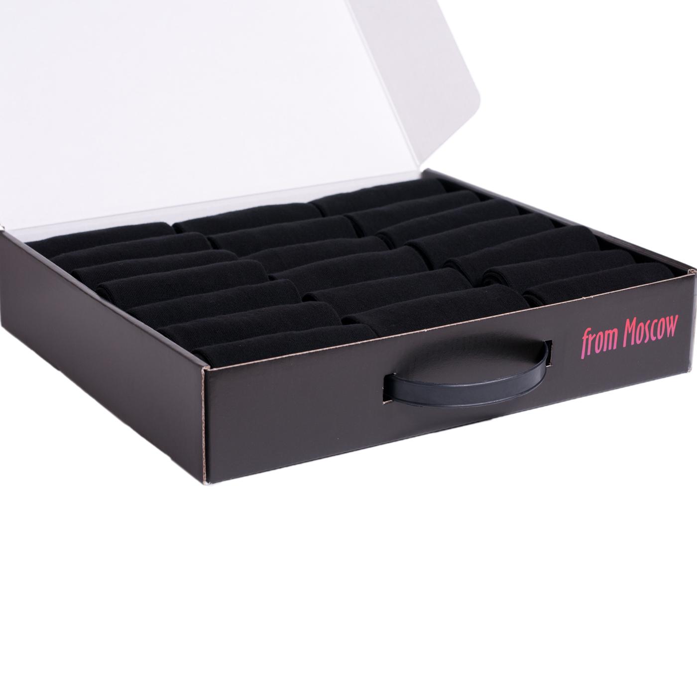 Носки свернуты в аккуратные рулончики внутри фирменного кейса. А чтобы он не потерся и не повредился при доставке, набор надежно упаковывается в транспортный плотный картон.