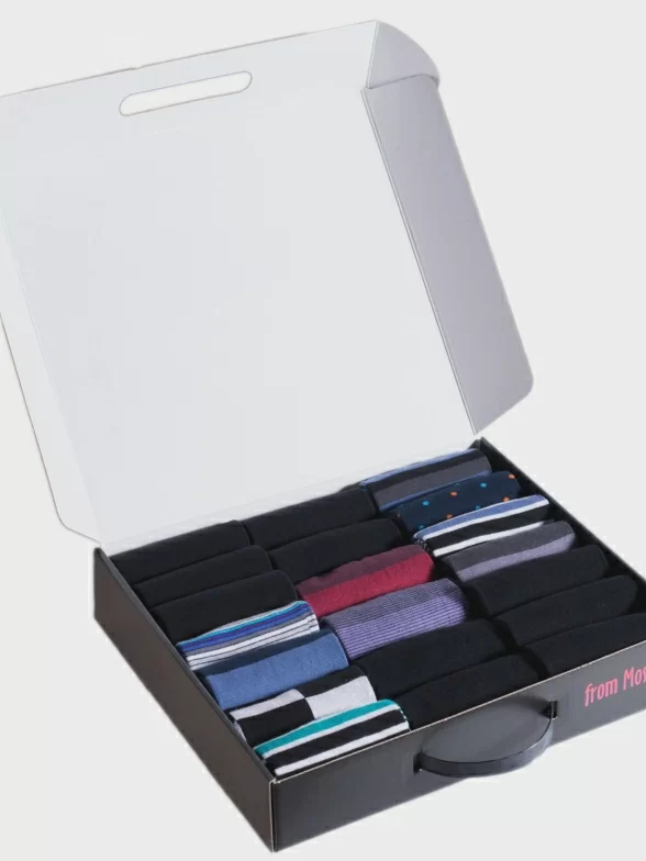 В этот набор мужских носков MSCLUB входят входят 10 пар в классическом черном цвете и 10 пар ярких носков с различными принтами, которые подойдут для любого повседневного образа.